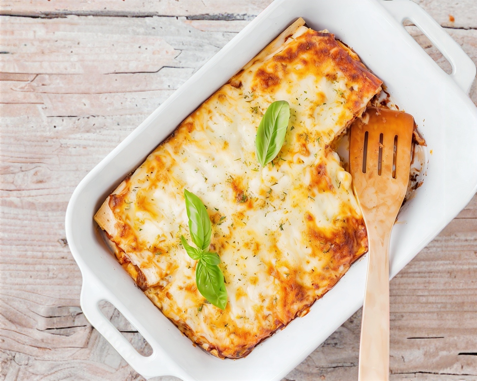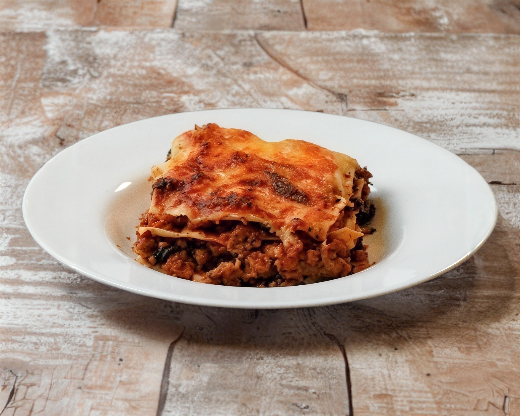 400 Gramos de deliciosa lasaña de carne preparada a la boloñesa. carne molida, champiñones, cebolla, salsa de tomate, salsa bechamel y queso gratinado.
