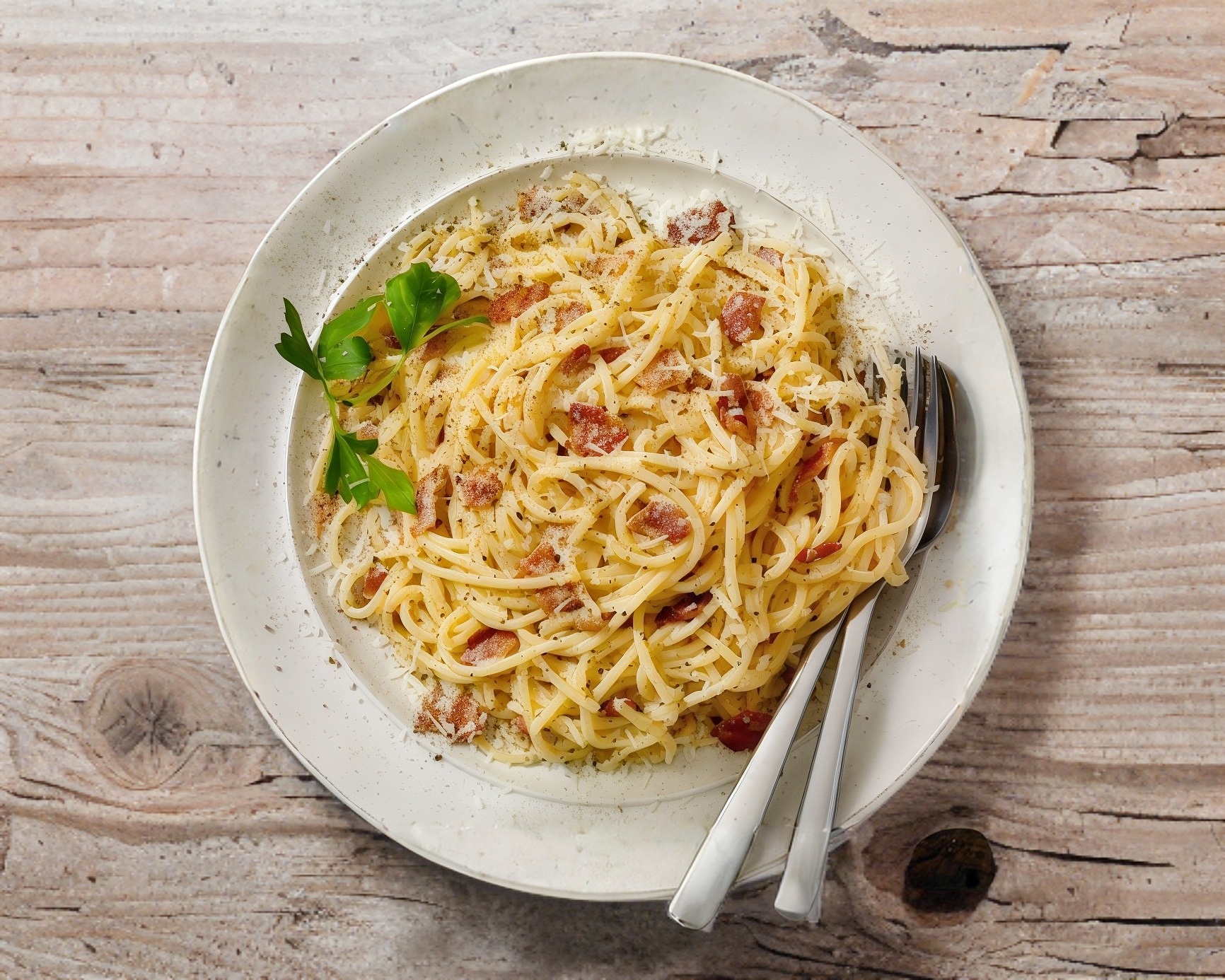 220 gramos de la pasta de tu elección con tocino, champiñones y cebolla. Bañada en una salsa de crema y huevo
