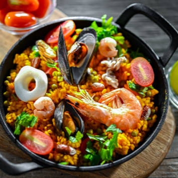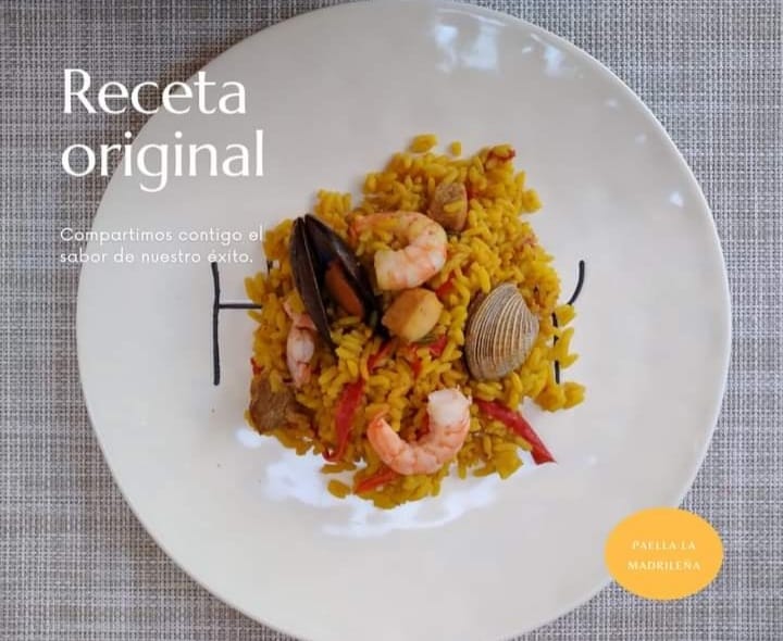350 gramos de paella. Alcanza para 1 persona. Contiene un delicioso sofrito de verduras, arroz, pollo, cerdo, camarones, mejillones y almejas. Cocinado con nuestro caldo que está elaborado con la receta secreta de papá.