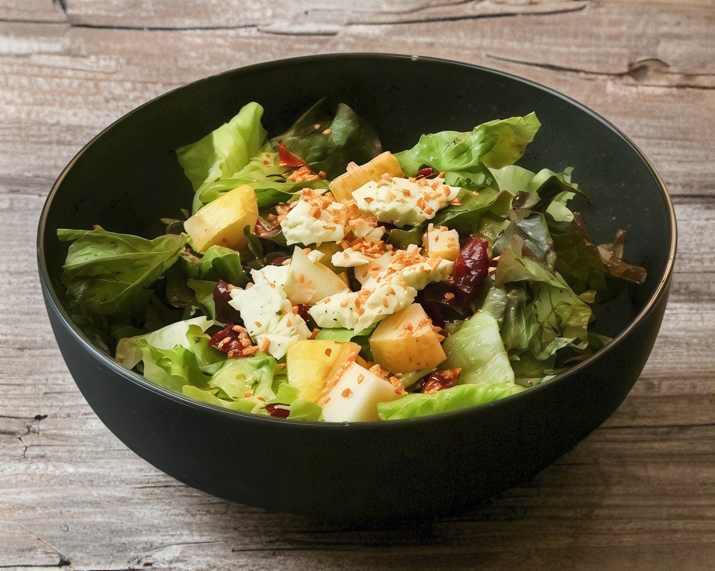 Lechuga, queso de cabra, pera, ajonjolí caramelizado y arándanos