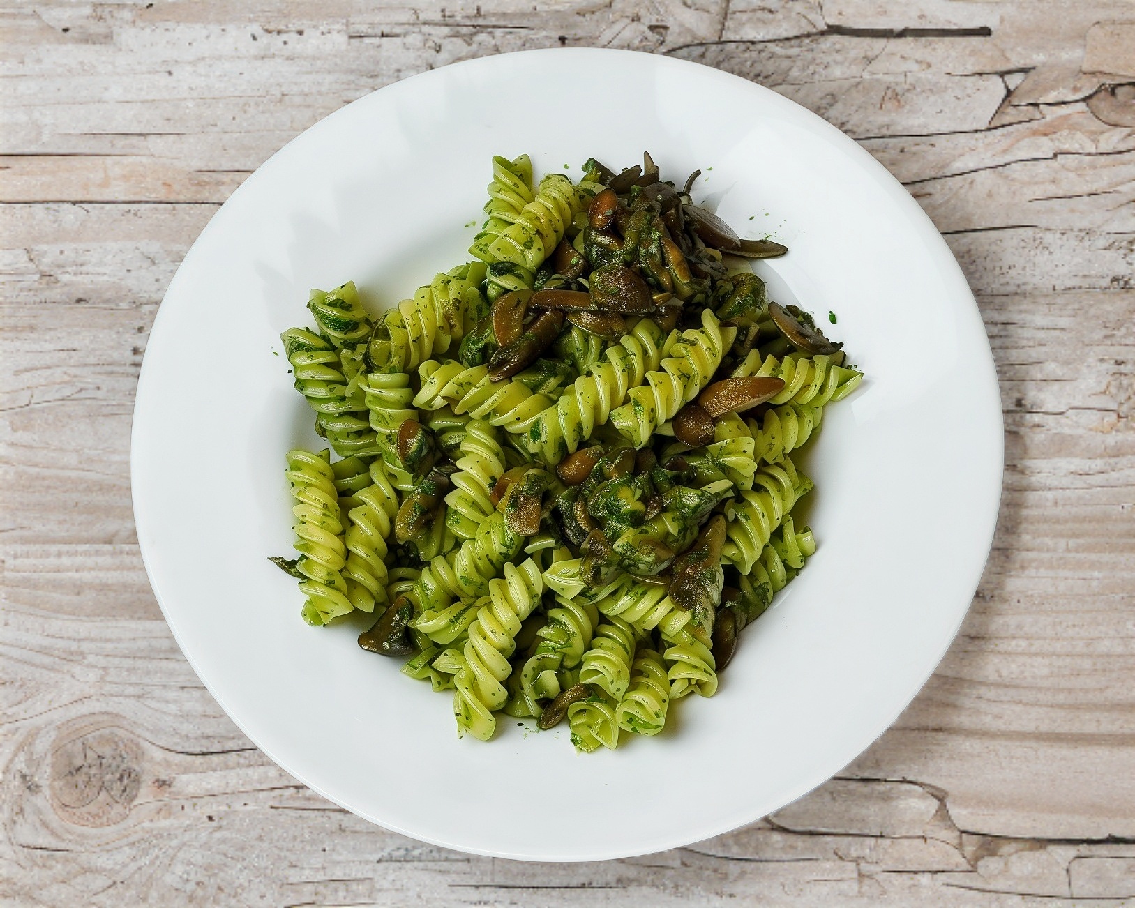 220 gramos de pasta de tu elección con salsa al pesto (contiene nuez) de espinacas y champiñones.