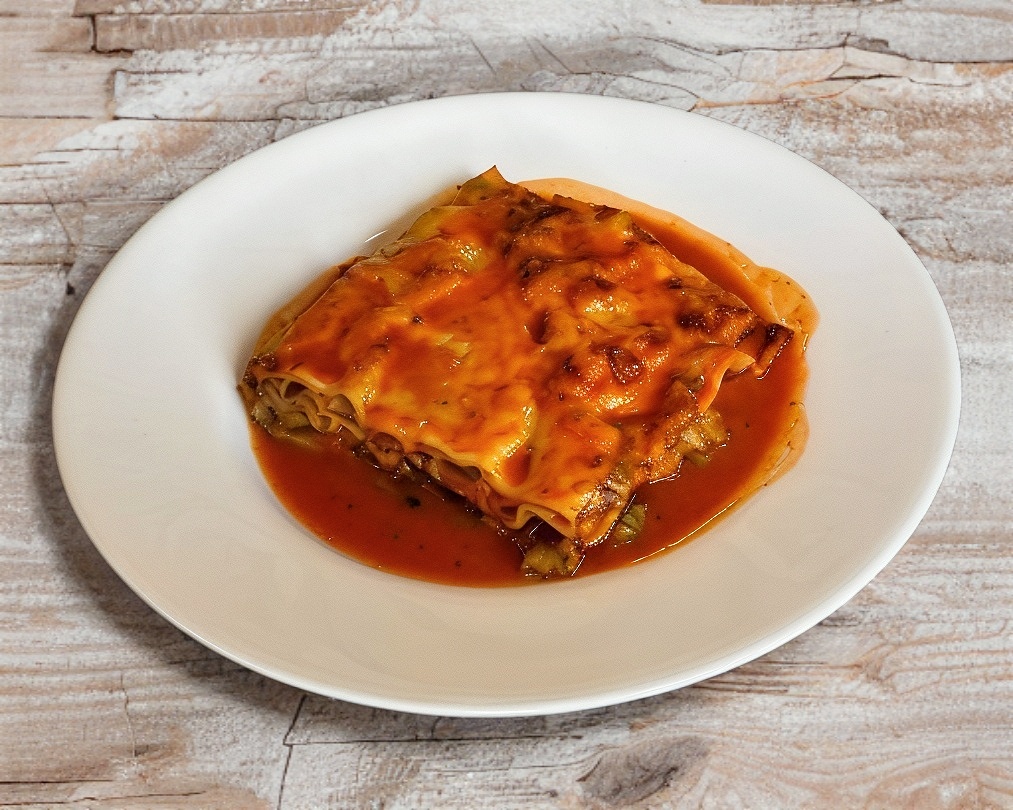 Lasaña a base de vegetales brócoli, champiñones, pimientos, calabacitas, cebolla, apio, zanahoria y deliciosa salsa de tomate. Con bechamel y gratinada.