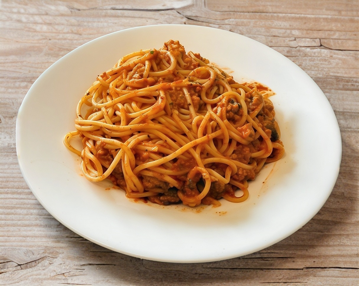 220 gramos de pasta de tu elección con salsa de carne molida, champiñones y cebolla y tomate