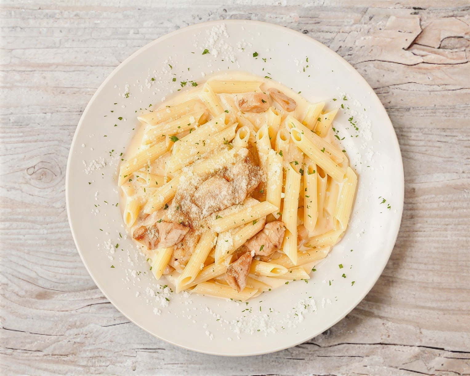 220 gramos de la pasta de tu elección bañada en salsa de crema, mantequilla y queso