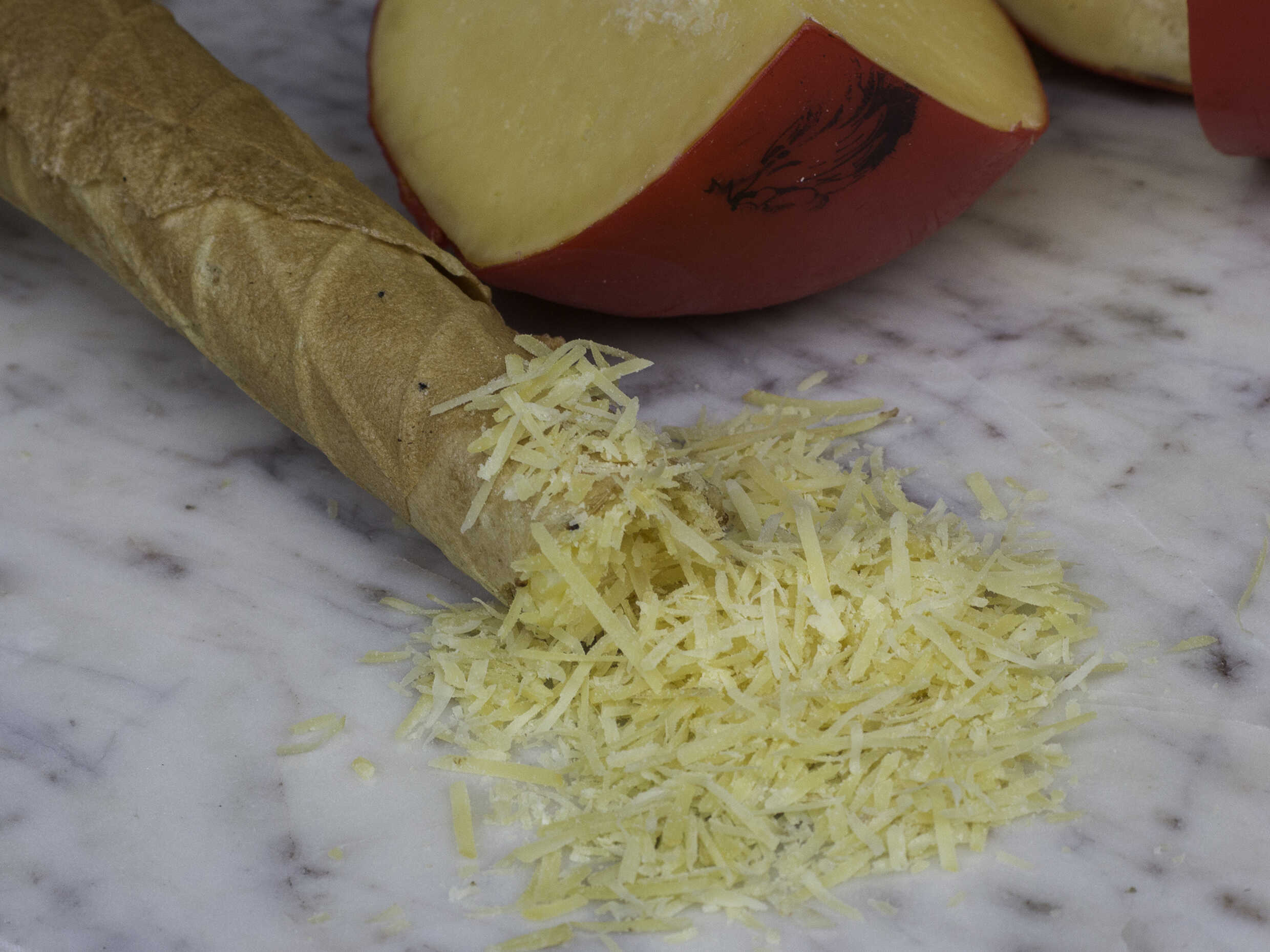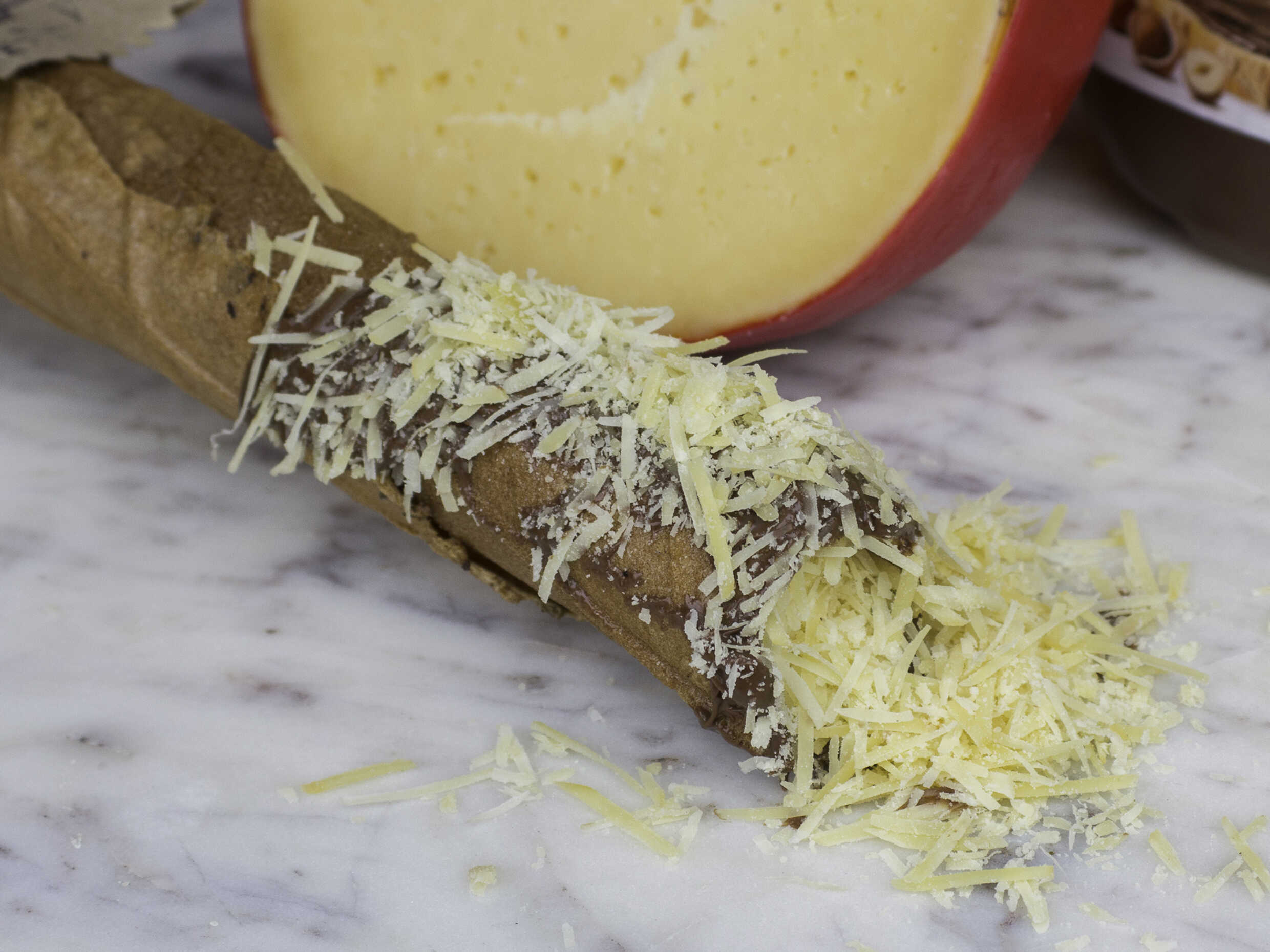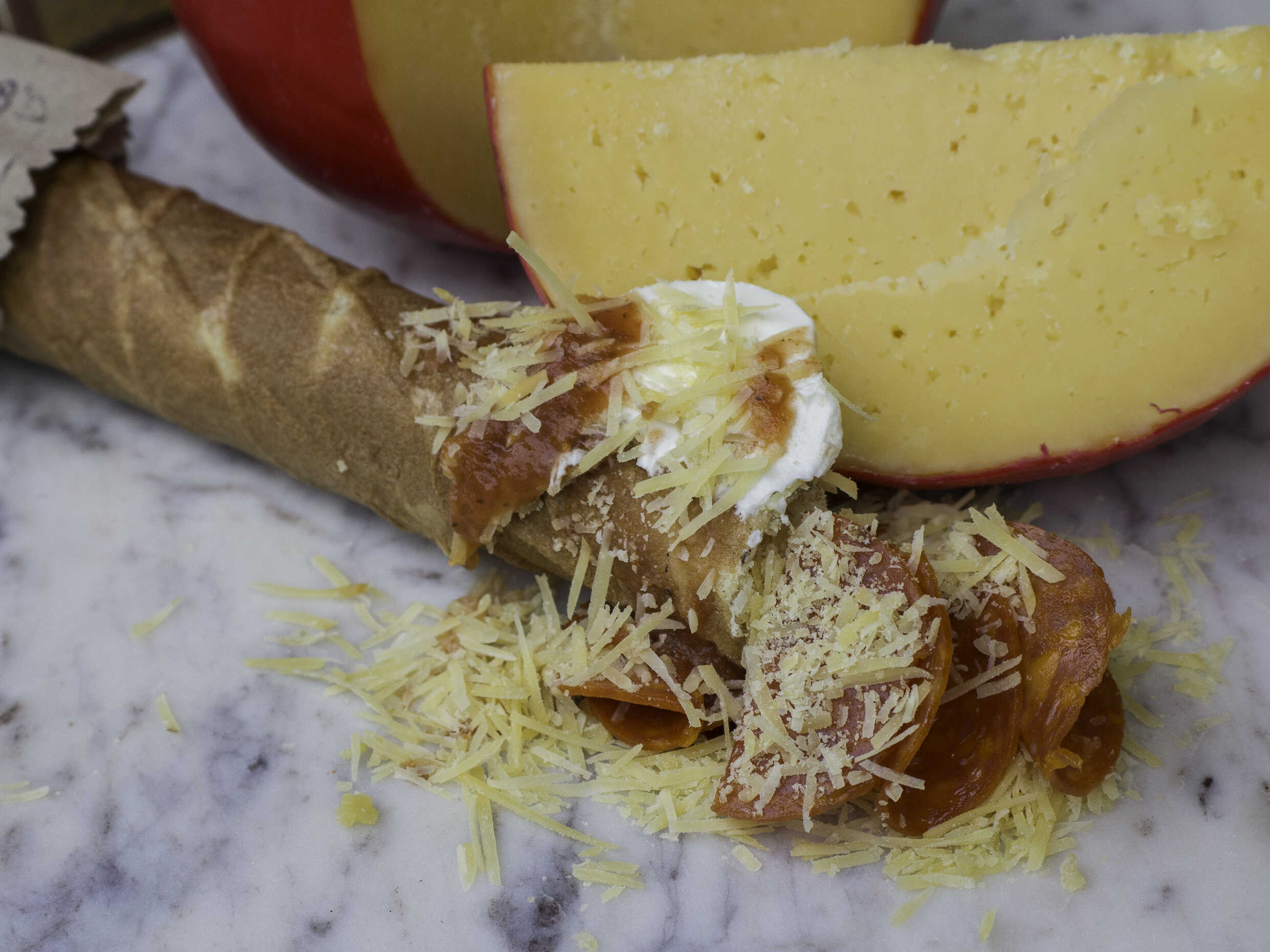 Oblea crujiente rellena de queso de Bola y jalea dulce a elegir