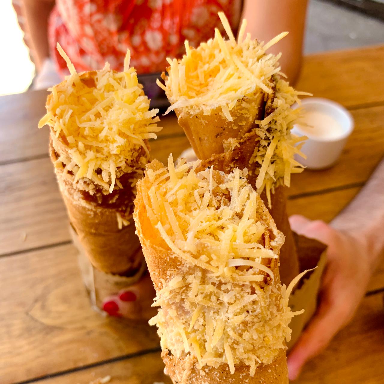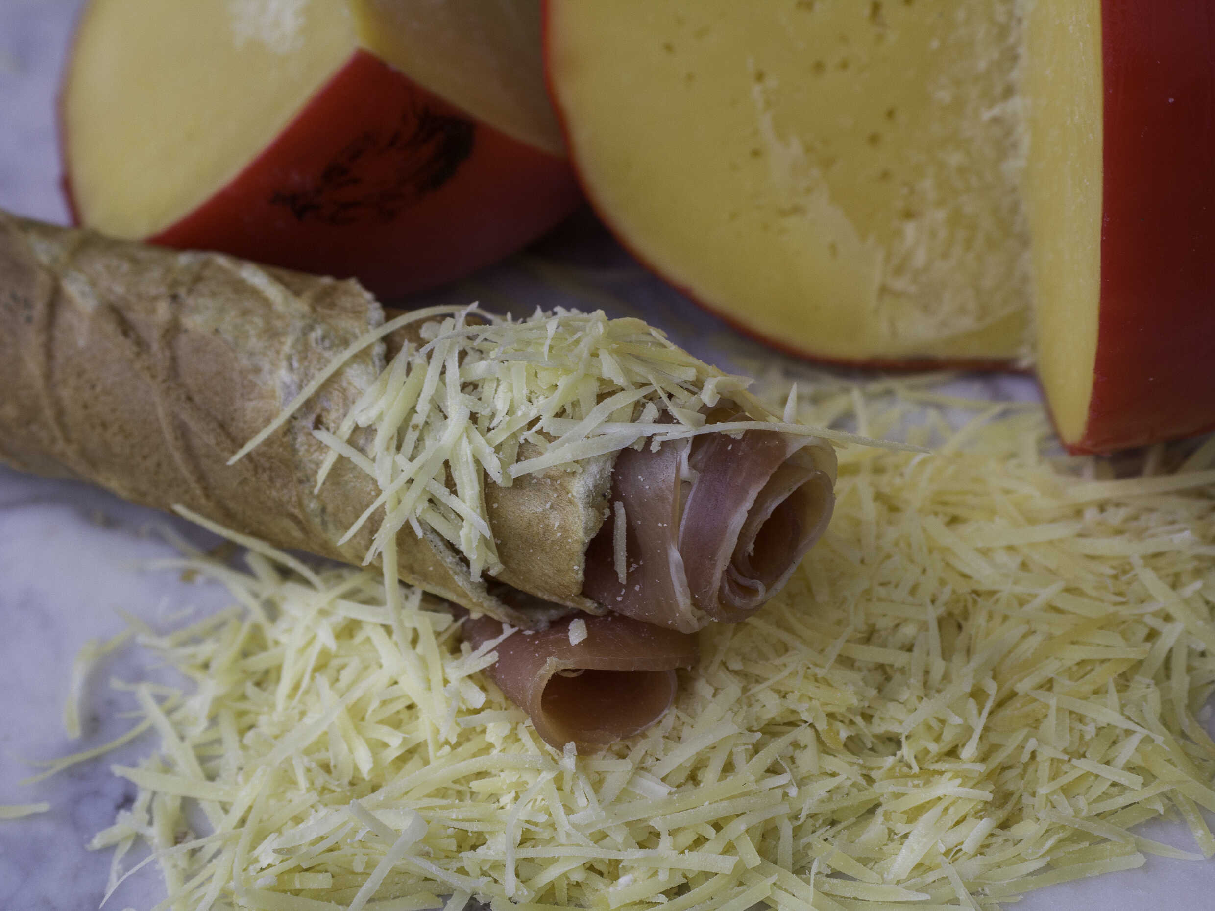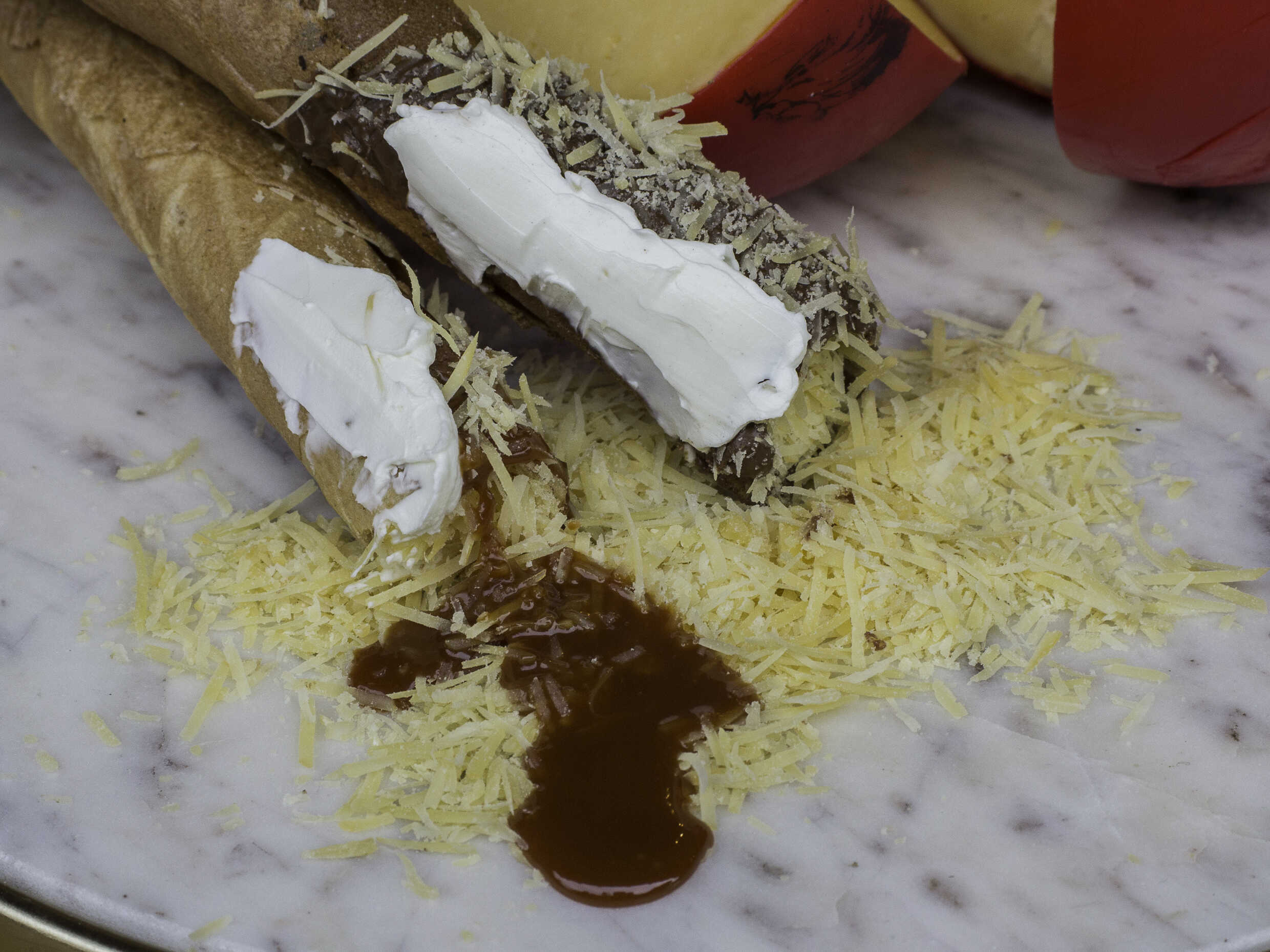 Oblea crujiente, rellena de Queso de Bola, Queso Philadelphia y Jamón Serrano.