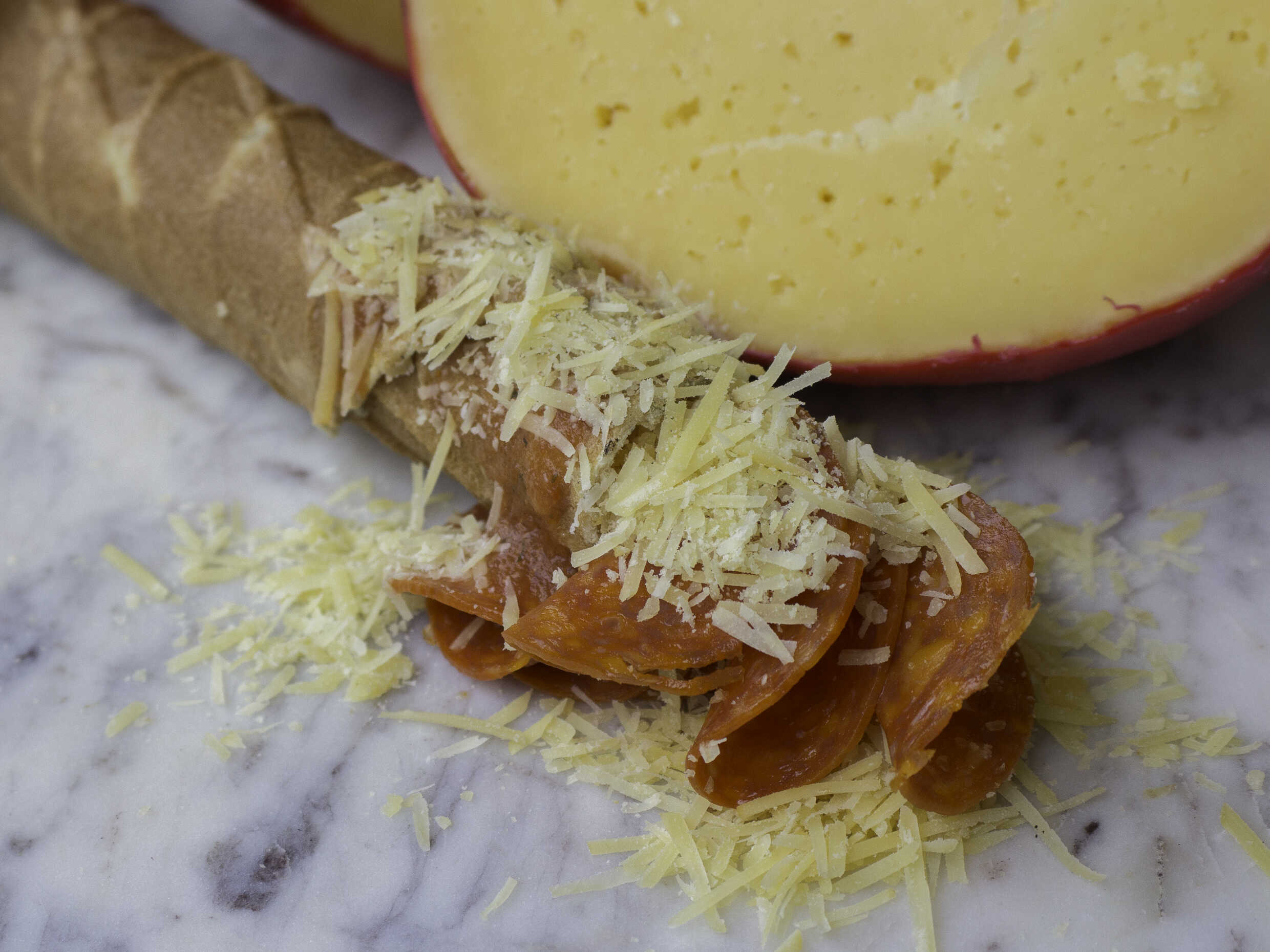 Oblea rellena de Queso de Bola, Pepperoni y Salsa de Tomate