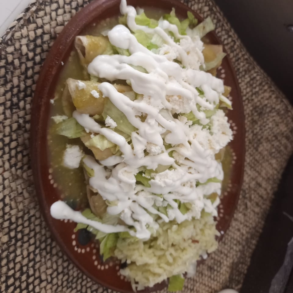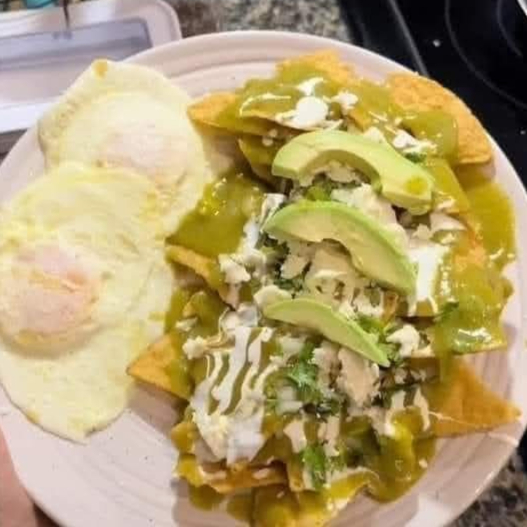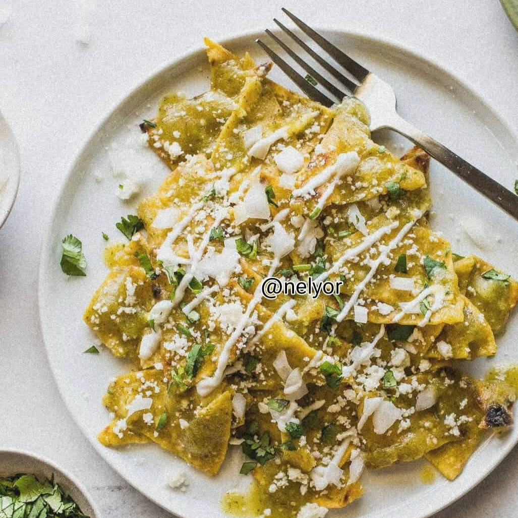 Totopos ,salsa verde,queso, crema,cebolla en rodajas acompañado de spalleti