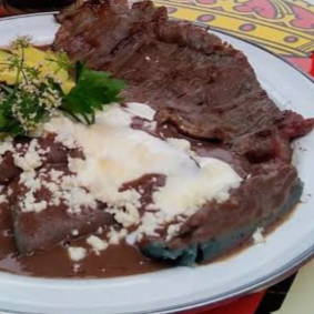 CHILAQUILES D FRIJOL NEGRO,CON ARRACHERA Y HUEVO