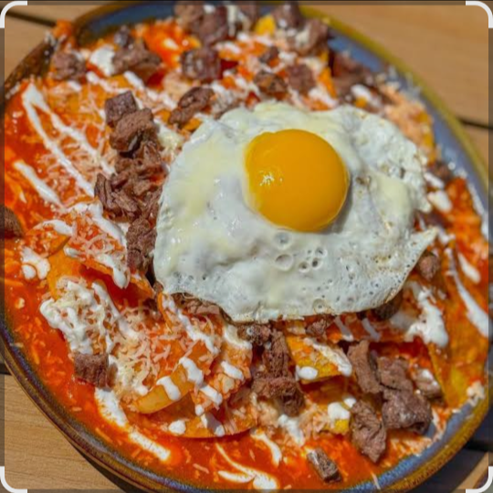 CHILAQUILES ROJOS CON ARRACHERA Y HUEVO