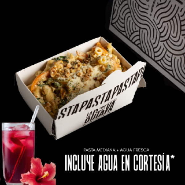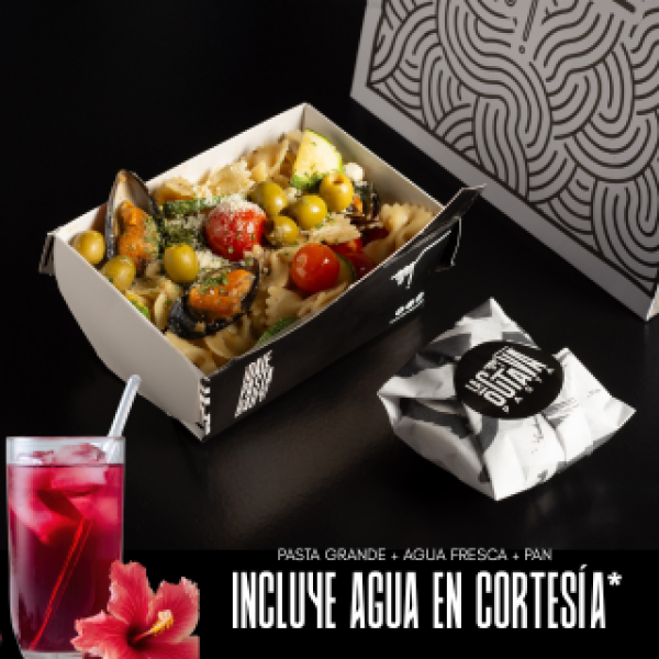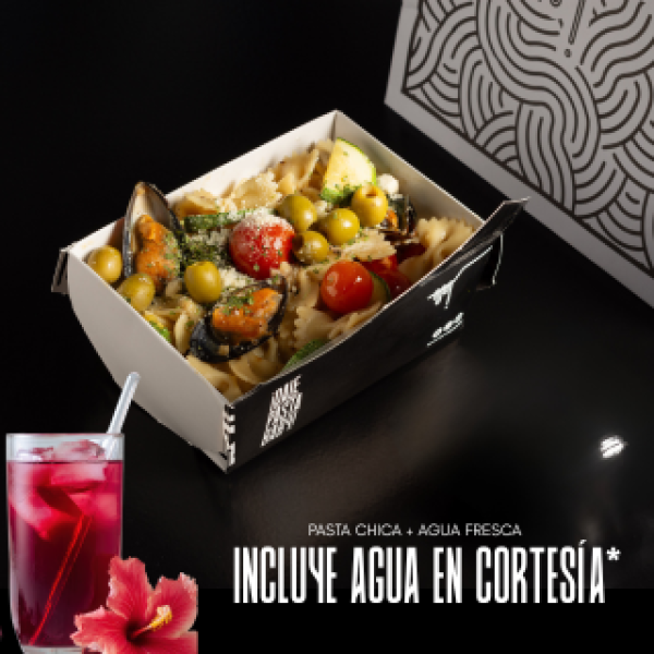 Pasta fusilli con salsa de pesto especial, pollo, mix de pimientos y jitomate cherry, acompañada de queso parmesano spicy y perejil como complemento. No incluye pan