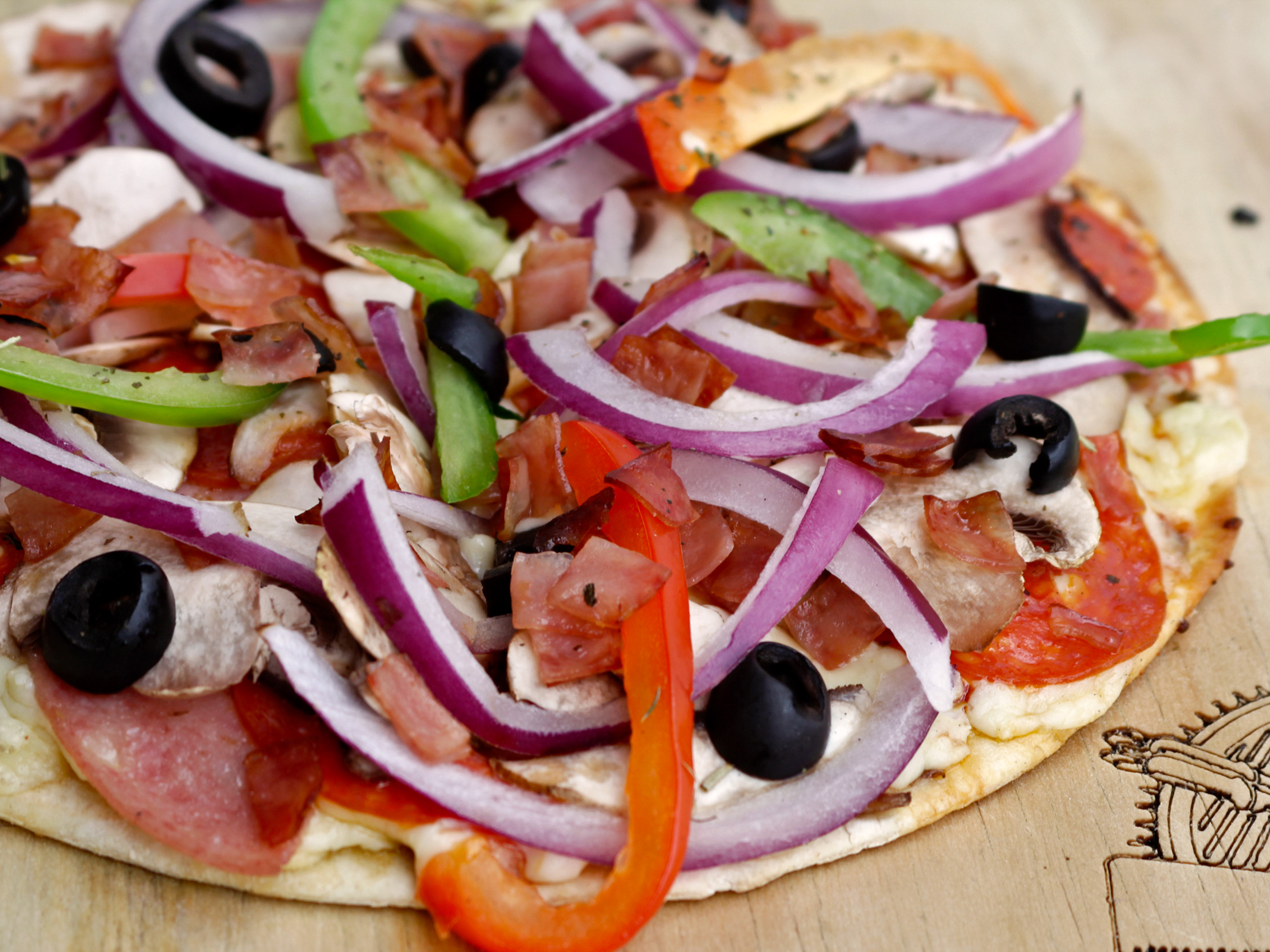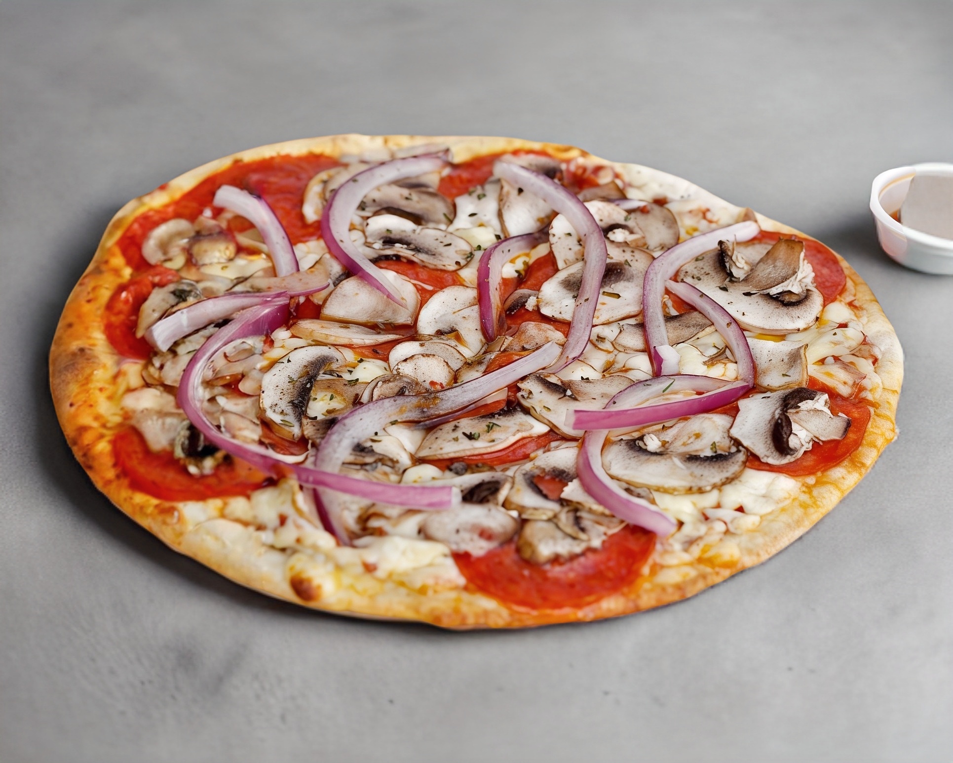 Salami, tocino, champiñones, cebolla, peperoni, pimiento , finas hierbas