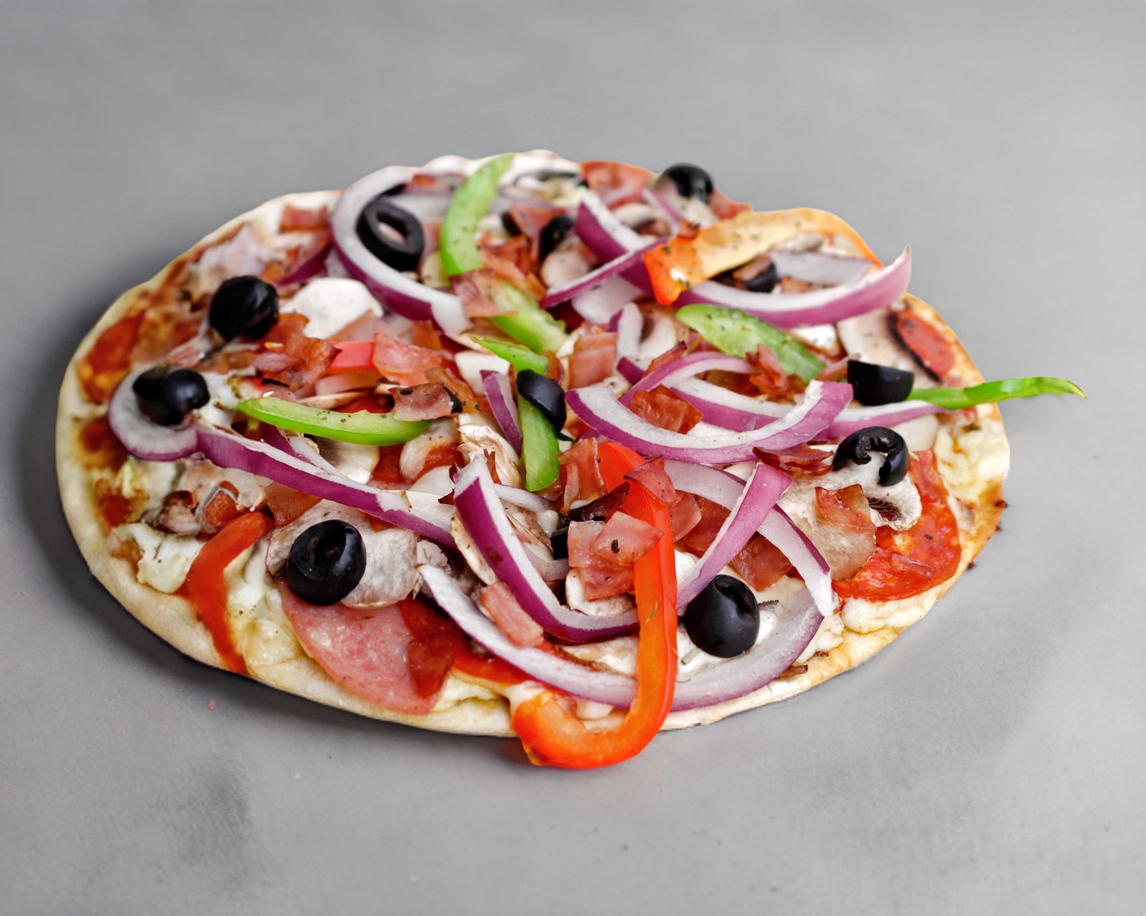 8 Rebanadas de 36 CM,Salami, tocino, champiñones, cebolla, peperoni, pimiento , finas hierbas