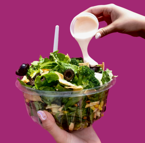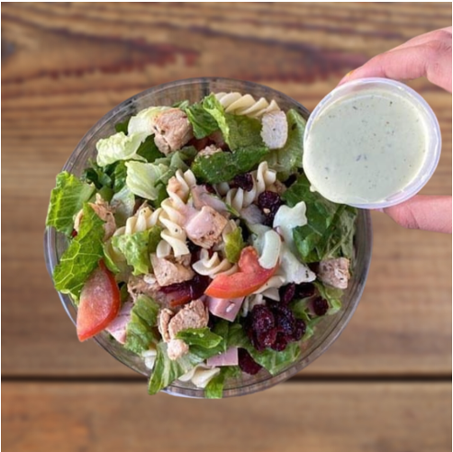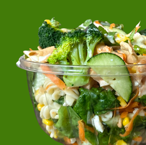 48 onzas. 2 porciones de pollo o marisco, más 3 ingredientes. Base de lechuga, crotones o tiras de maíz, queso parmensano y aderezo.