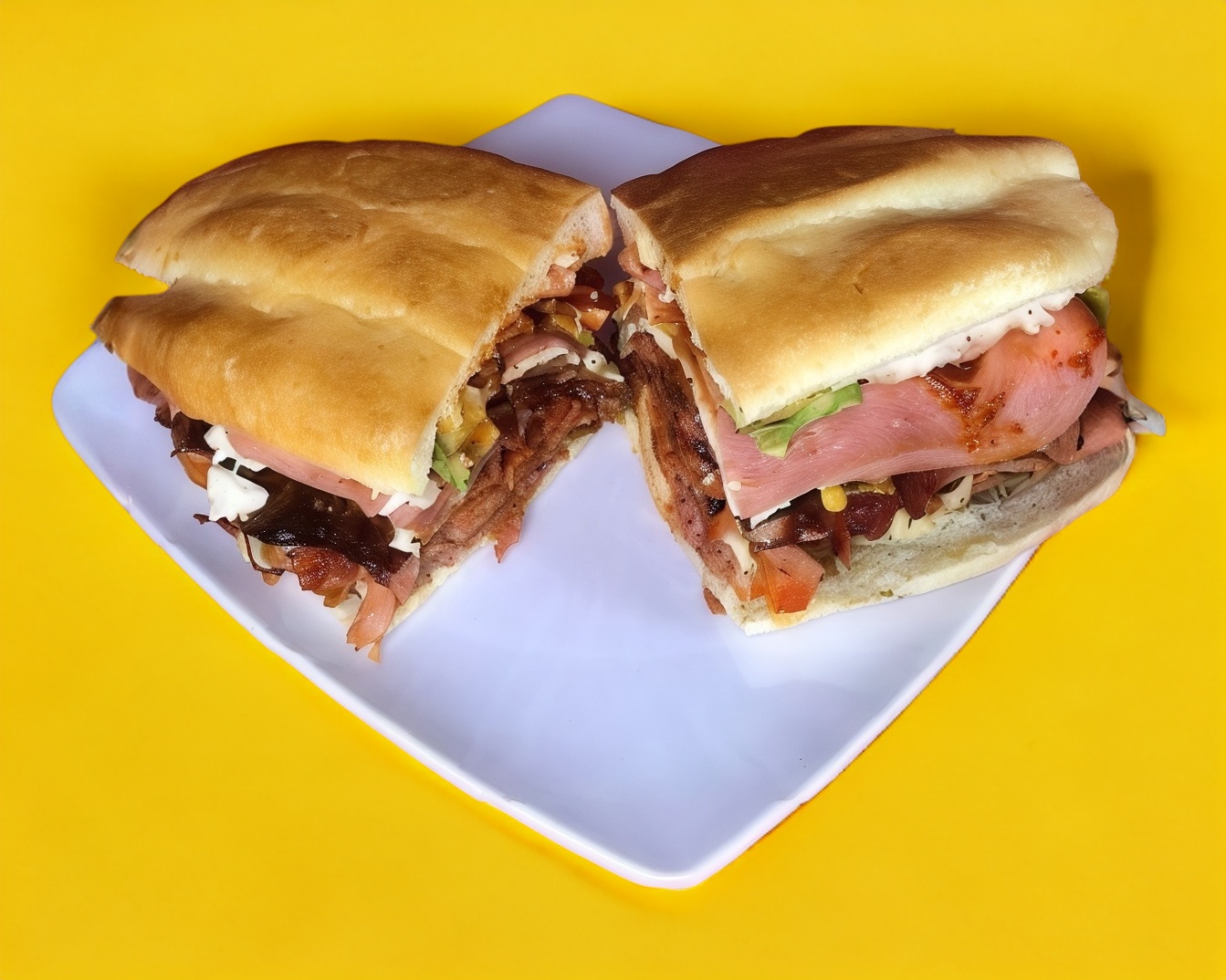 Pan grande con Pierna, jamón, piña, queso oaxaca,queso amarillo,frijoles, chipotle, mayonesa, jitomate, cebolla y aguacate.