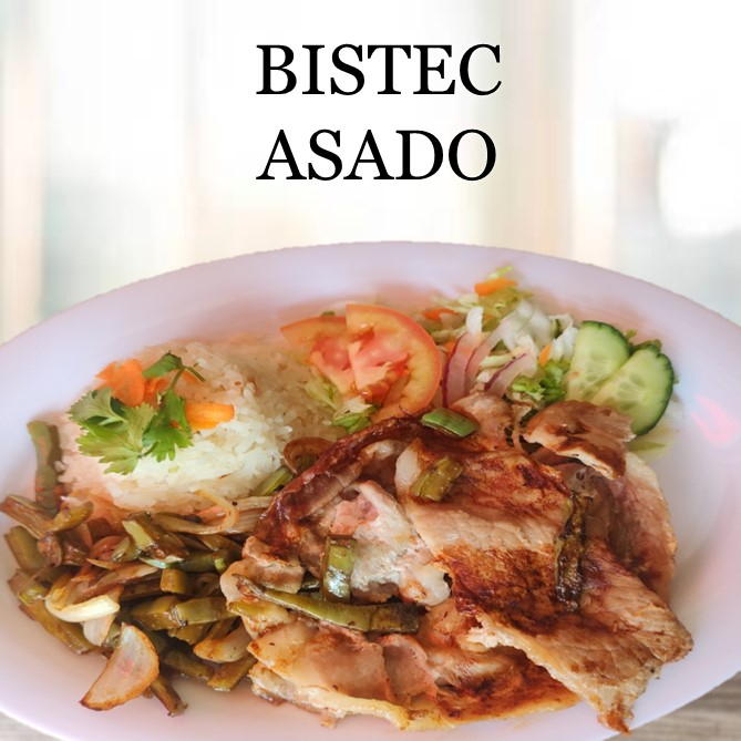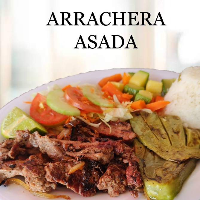 Con arroz o sopa fría, frijoles, ensalada, salsa, tortillas y agua de fruta del dia.