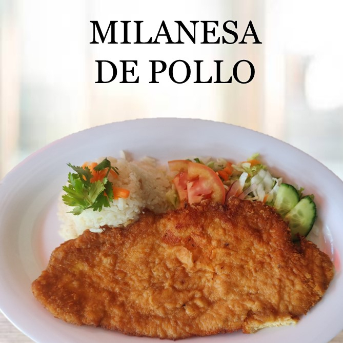 Milanesa gratinada con queso oaxaca, arroz o sopa fría, frijoles, salsa, tortillas y agua de fruta del dia.