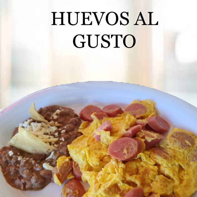 Acompañados de frijoles refritos, incluye café o té, bolillo o tortillas, fruta y agua.