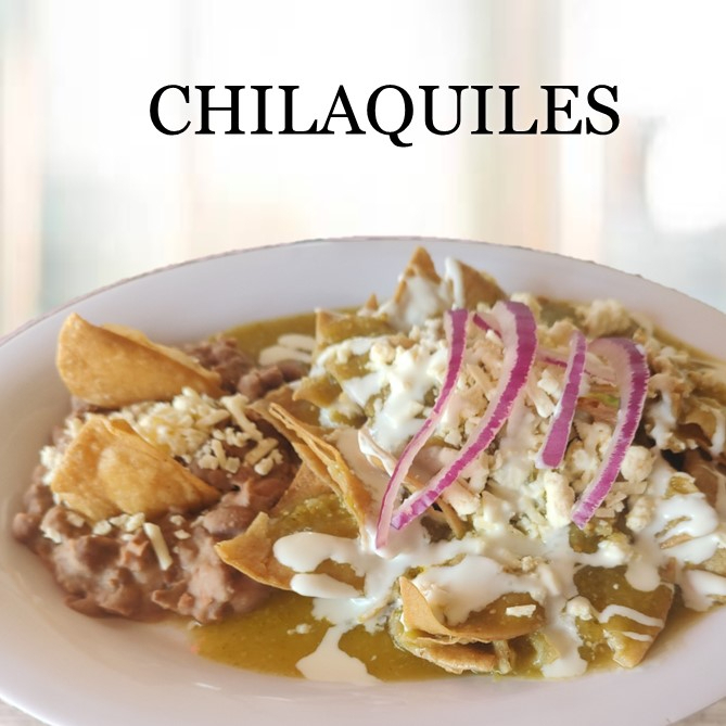 Chilaquiles en salsa verde o roja, con frijoles refritos, queso y crema, incluye café o té, bolillo y vaso con agua.