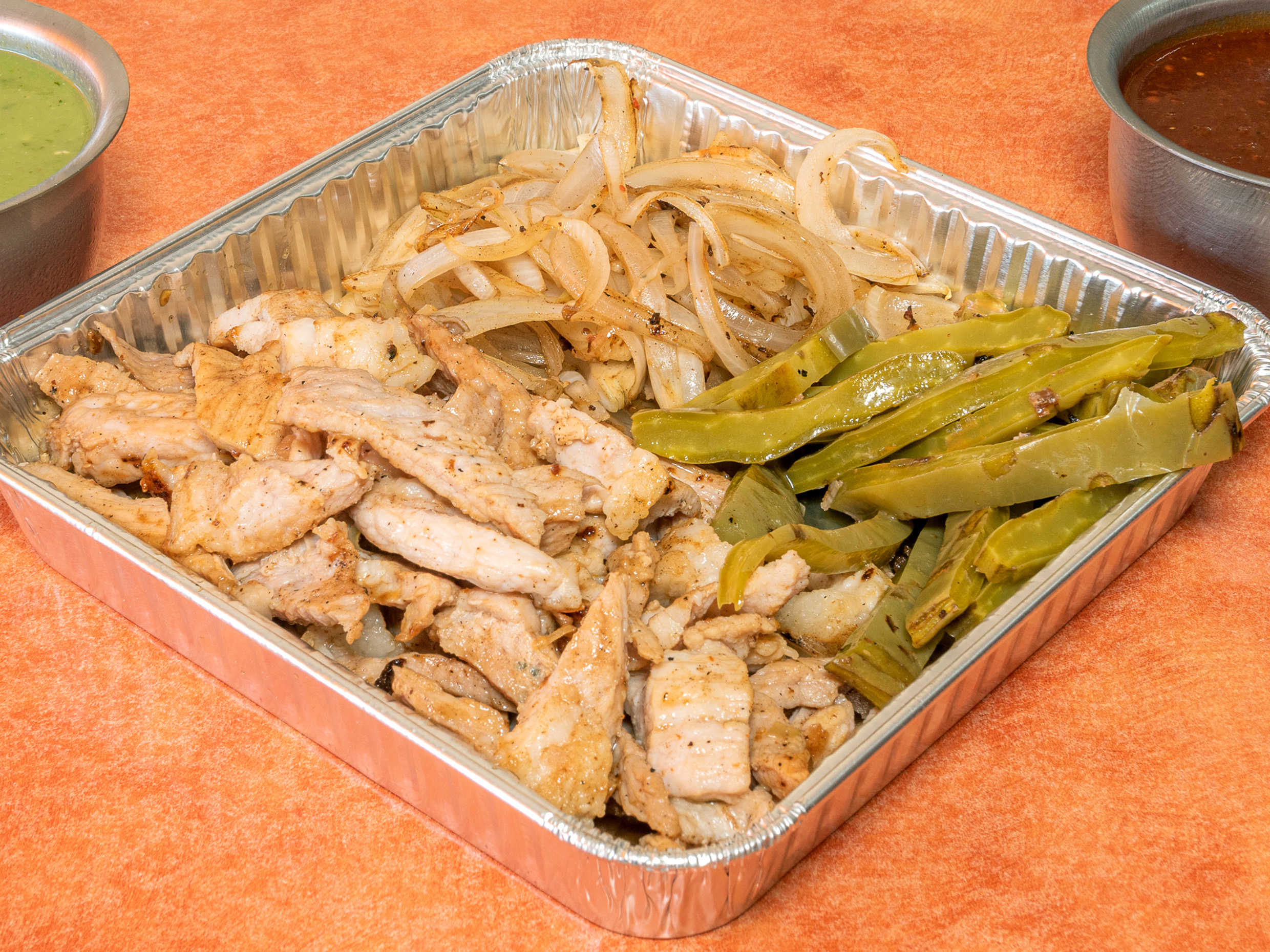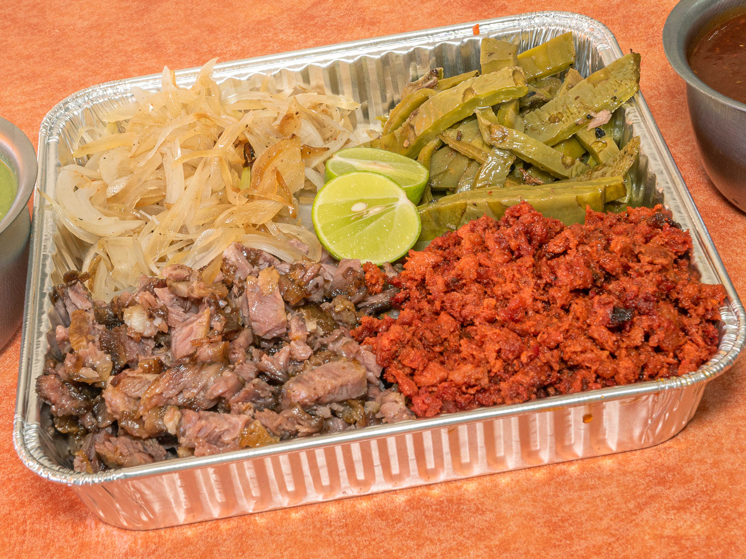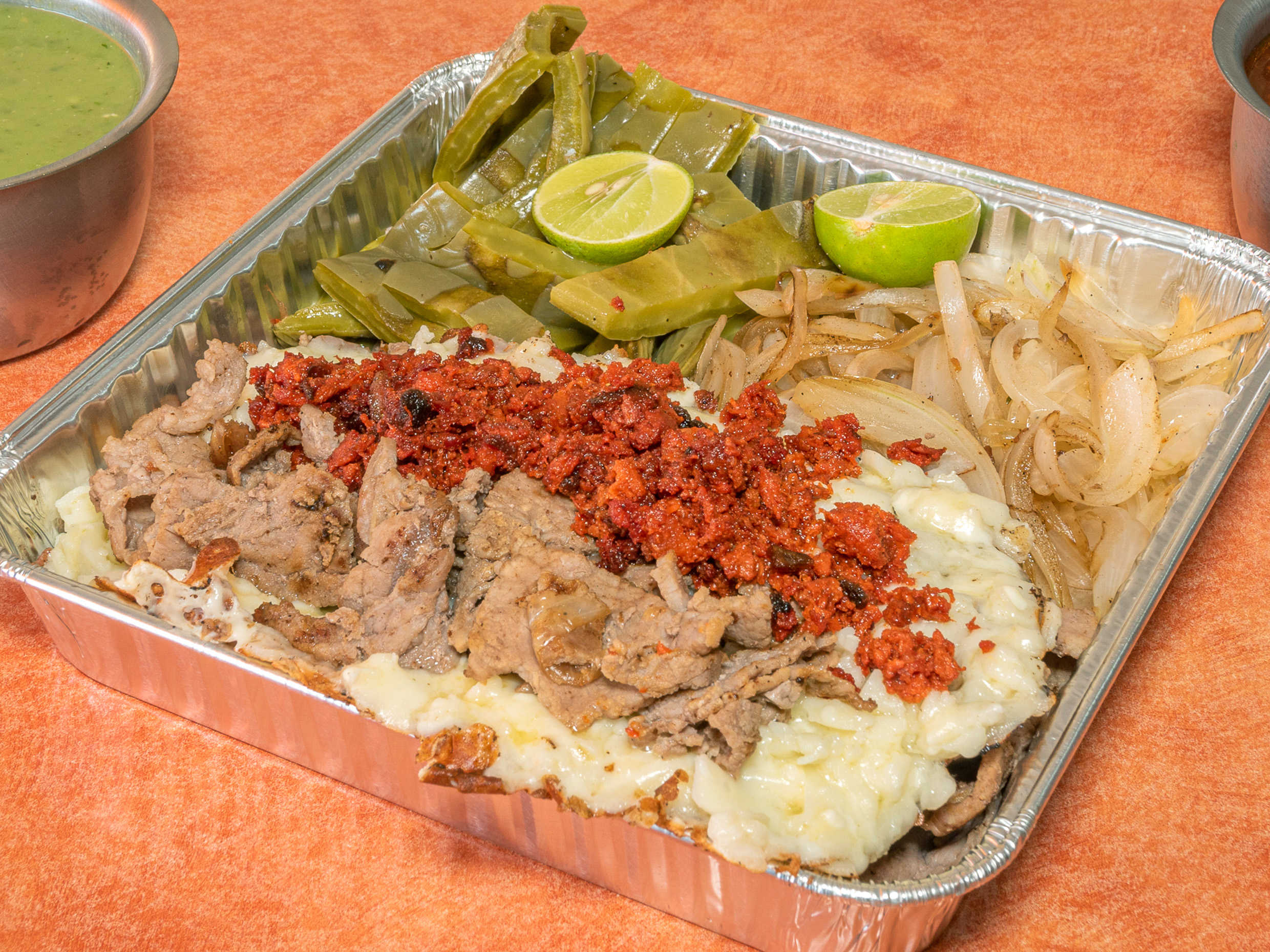 Salchicha, tocino, queso Oaxaca, jitomate, cebolla, chiles. Cátsup, mostaza y mayonesa.