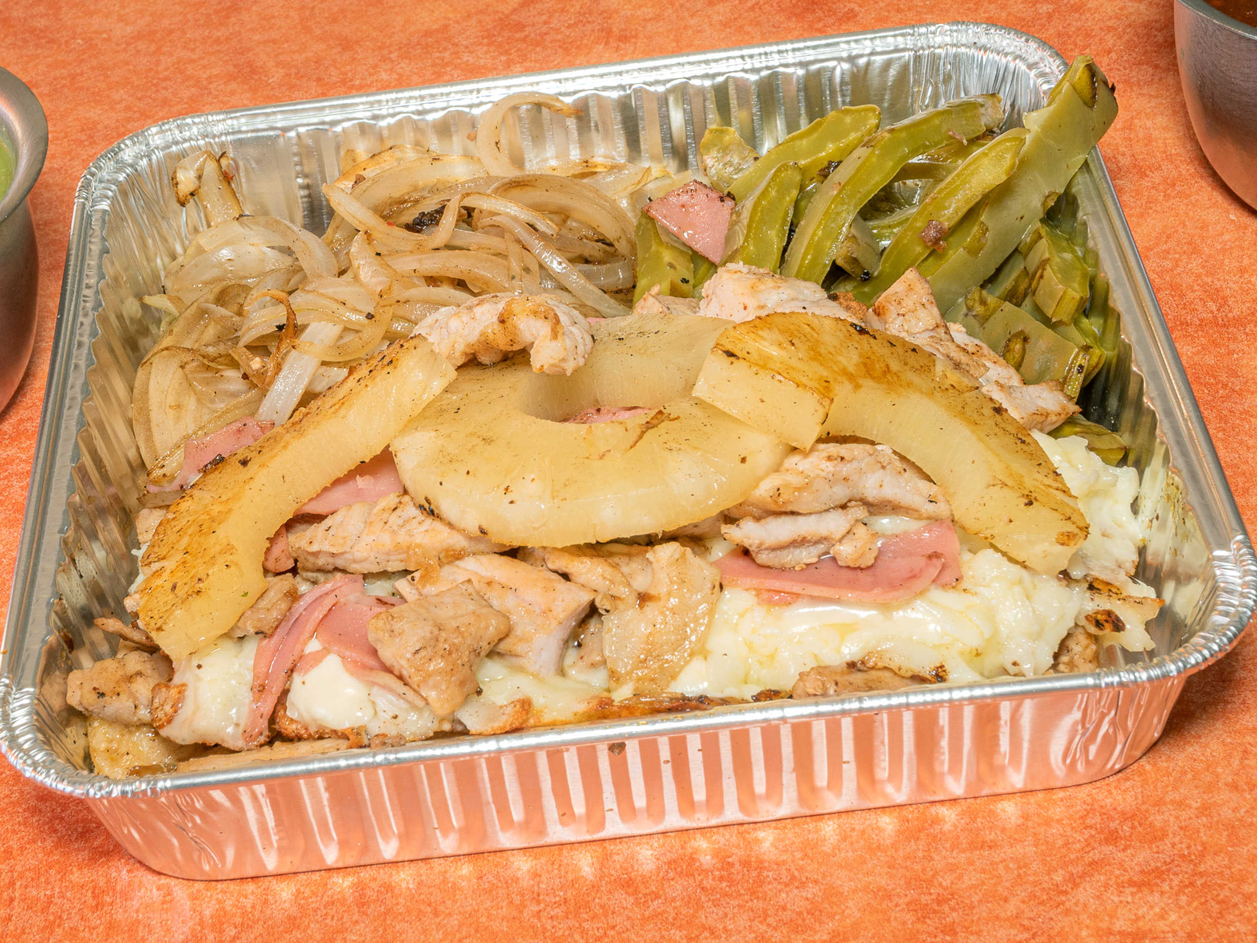 Carne selecta de arrachera (150gr), carne al pastor, jamón, tocino queso amarillo, queso oaxaca, piña, jitomate, cebolla, chiles, aguacate en un pan artesanal con ajonjolí negro. cátsup, mostaza y mayonesa.