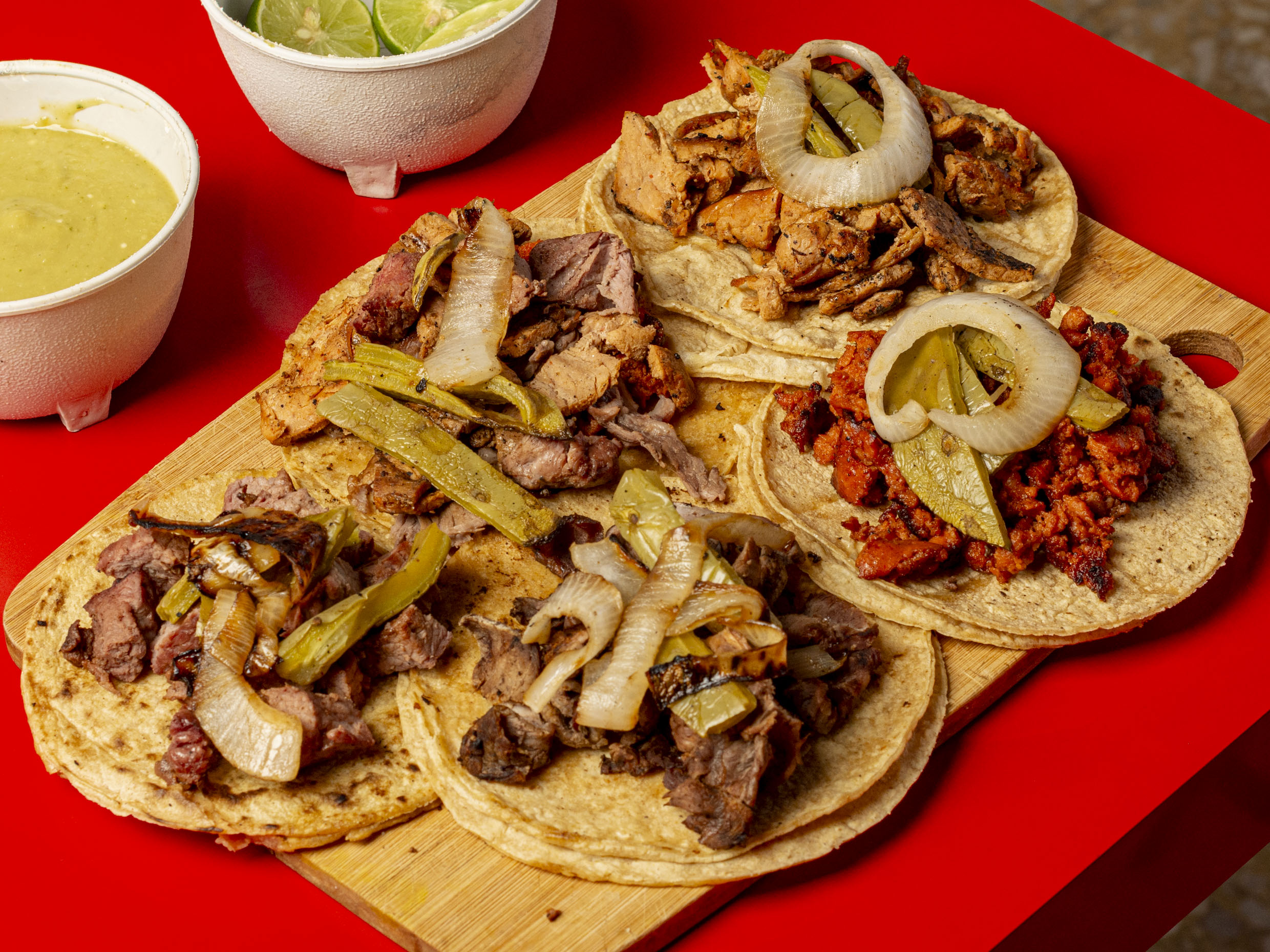2 TORTILLAS TAMAÑO NORMAL, ADOBADA BIEN SERVIDA, CEBOLLA ASADA, NOPALES O PEPINOS, SALSA O CHILES TOREADOS