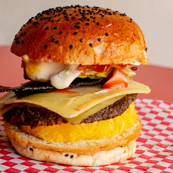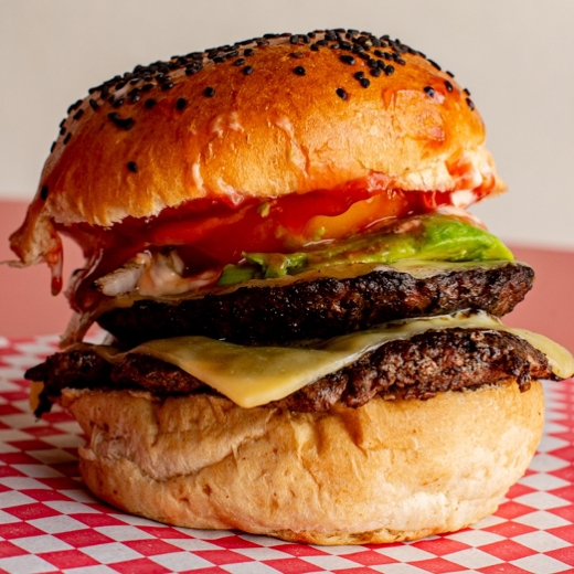 pan artesanal carne de res, 2 capas queso gouda, 2capas queso oaxaca, aguacate, jitomate,cebolla asada, mayonesa, mostaza y catsup