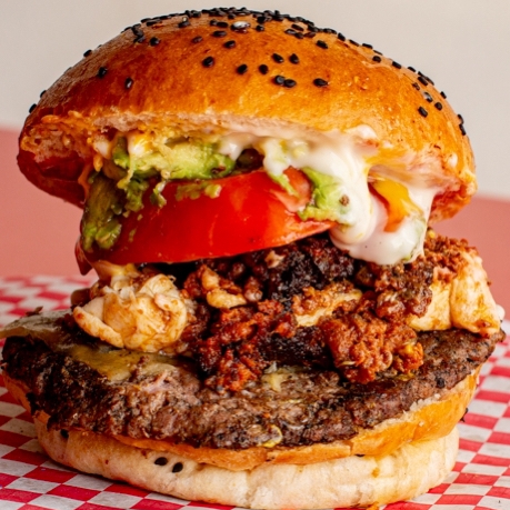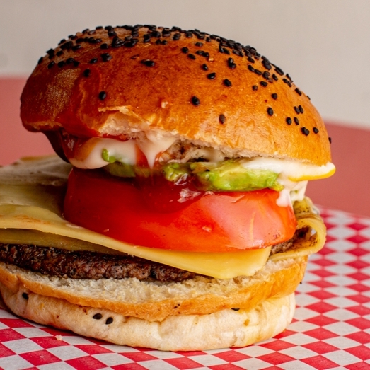 pan artesanal, carne de res, queso oaxaca, aguacate, jitomate, cebolla asada, mayonesa, mostaza y catsup