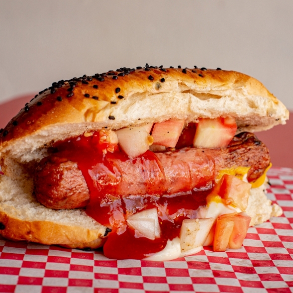 Pan artesanal, salchicha de pavo bañada en salsa de mango, jitomate, cebolla, mayonesa, mostaza y cátsup.