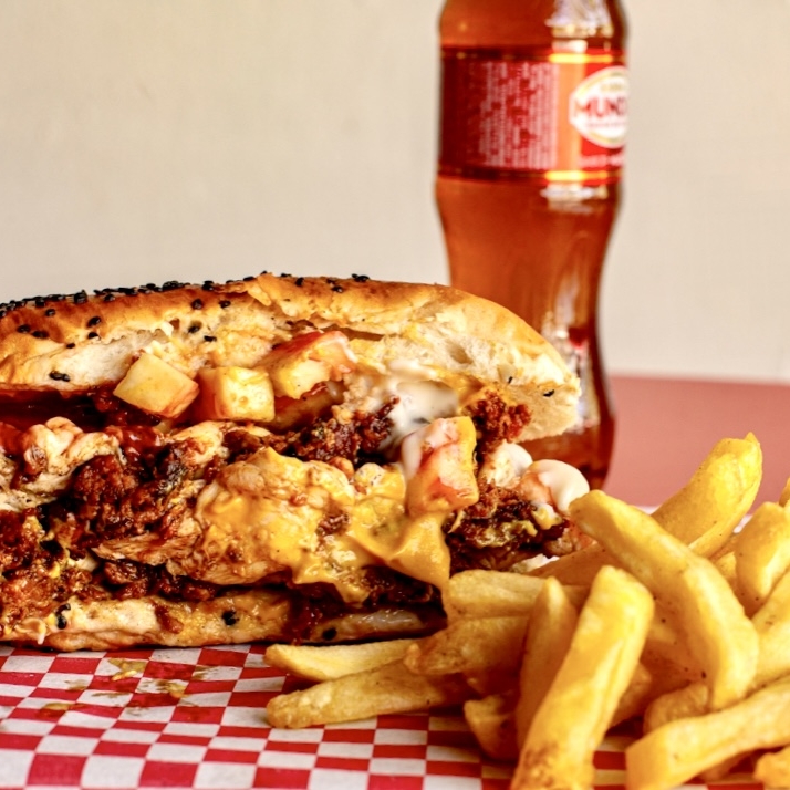 Hamburguesa godzilla a tu elección, papas grandes y refresco de 600 ml.