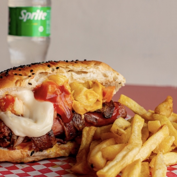 pan artesanal, carne de res, choriqueso, aguacate,jitomate,cebolla asada, mayonesa, mostaza y catsup
