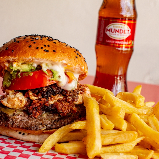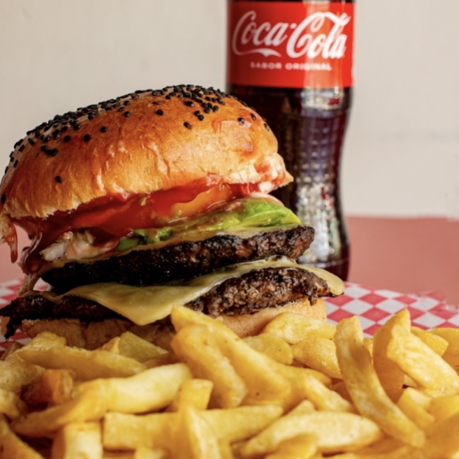 Hamburguesa aguacatosa, papas medianas y refresco de 355 ml.