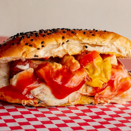 Pan artesanal, salchicha de pavo, queso oaxaca, jitomate, cebolla, mayonesa, mostaza y cátsup.