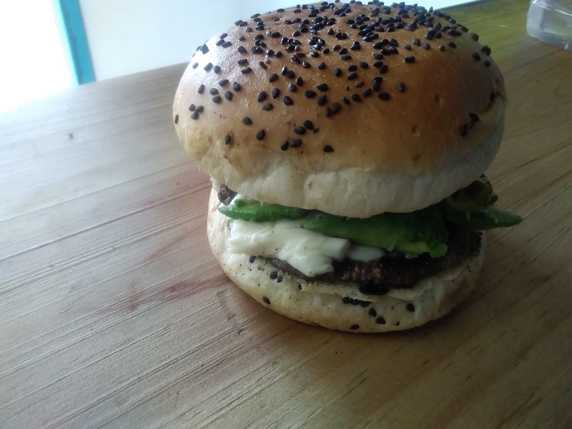 panartesanal, carne de res queso gouda, aguacate, jitomate,cebolla asada,mayonesa mostaza y catsup
