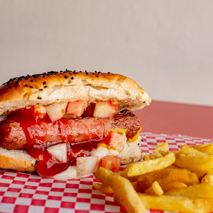 Pan artesanal, salchicha de pavo, choriqueso, jitomate, cebolla, mayonesa, mostaza y cátsup.