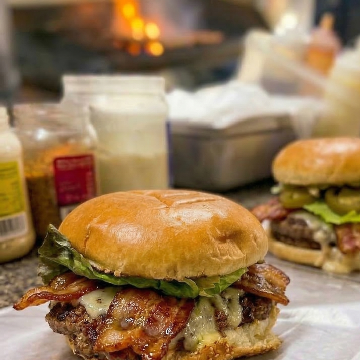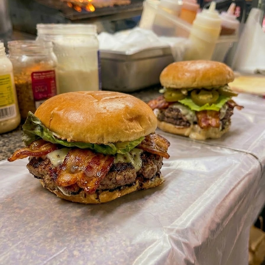 Molida de res nacional 100 gramos, tocino, queso, verduras y aderezos.