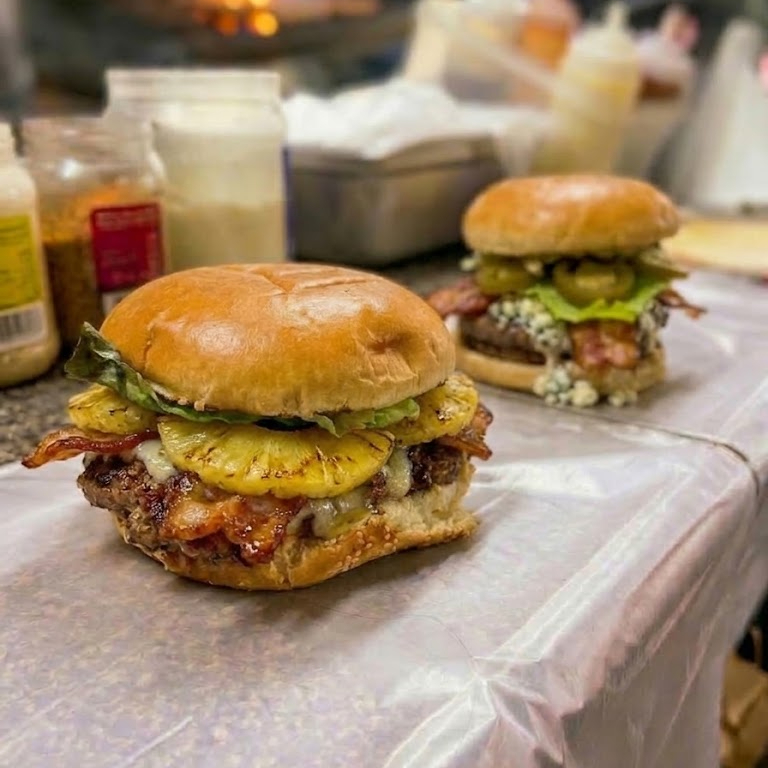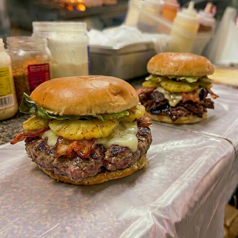 Molida de res nacional 100 gramos, tocino, piña, queso, verduras y aderezos.