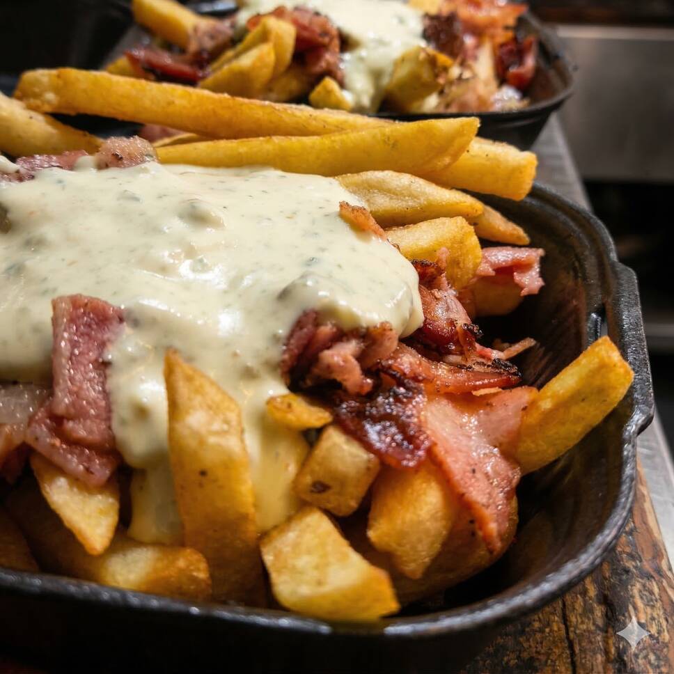 Papas a la francesa o gajo 200 g con delicioso aderezo especial de la casa y tocino.