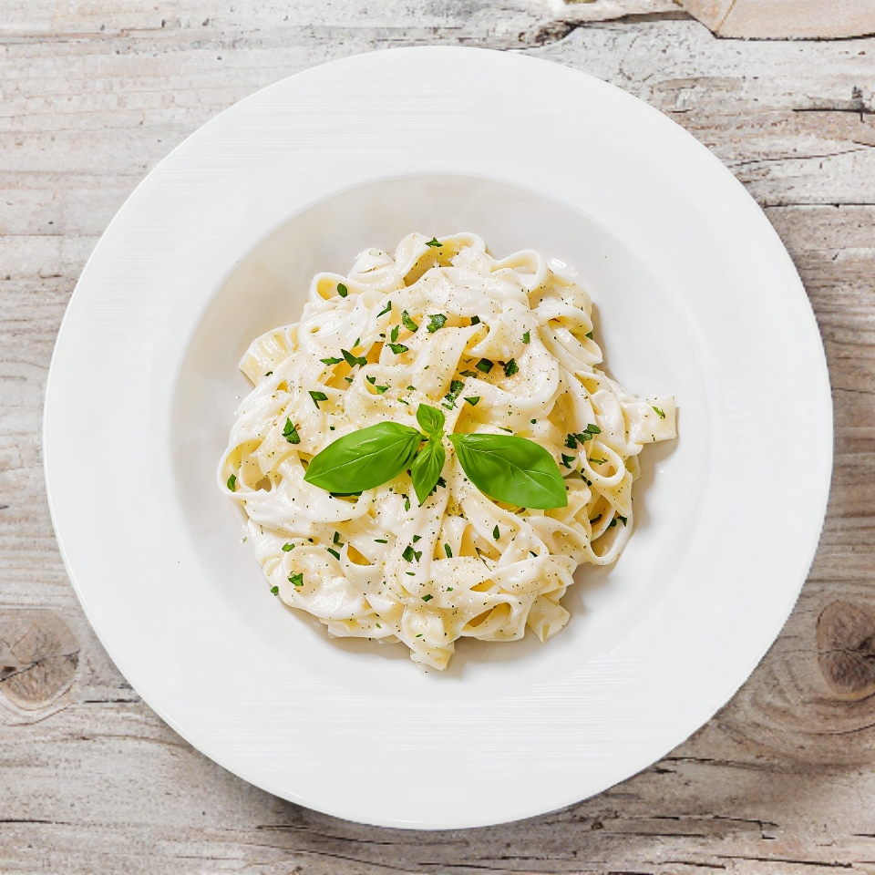 220 gramos de pasta fusili o espagueti con mantequilla,crema, queso y albahaca