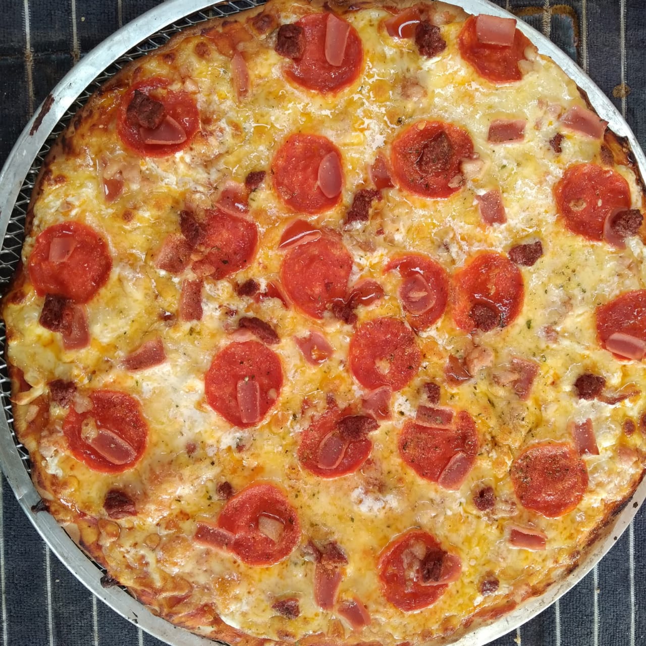 Pizza de 30 cm de jamón, pepperoni, tocino y chorizo.