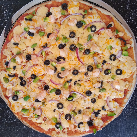 Pizza de 30 cm de cebolla, aceitunas, pimiento, champiñones y alcachofa.