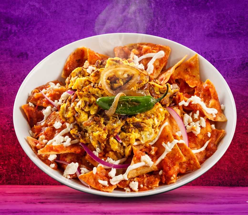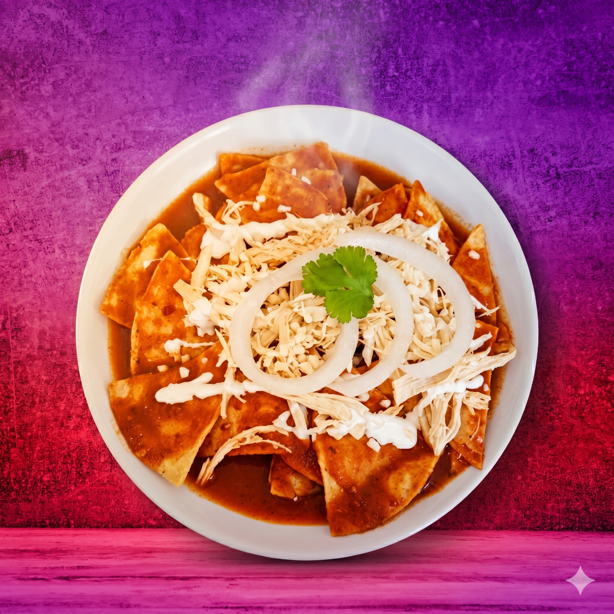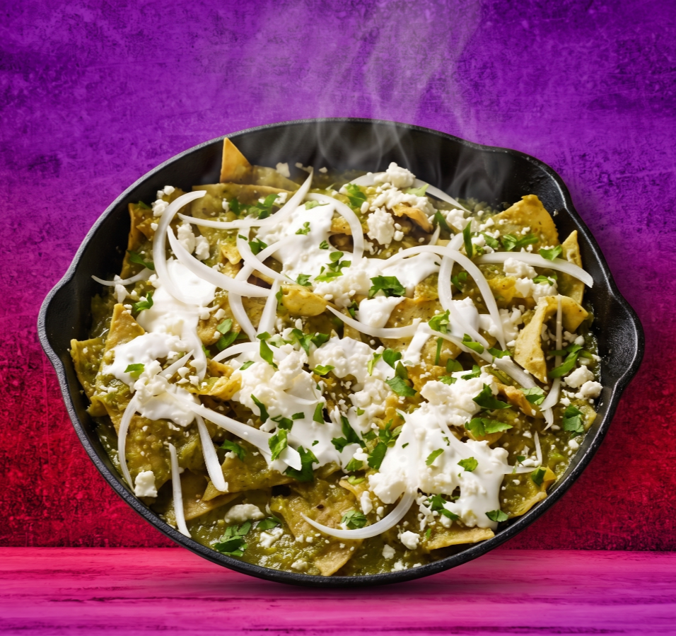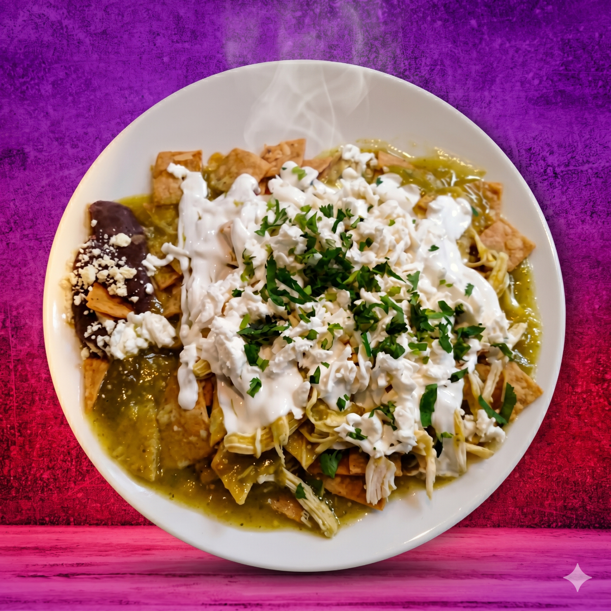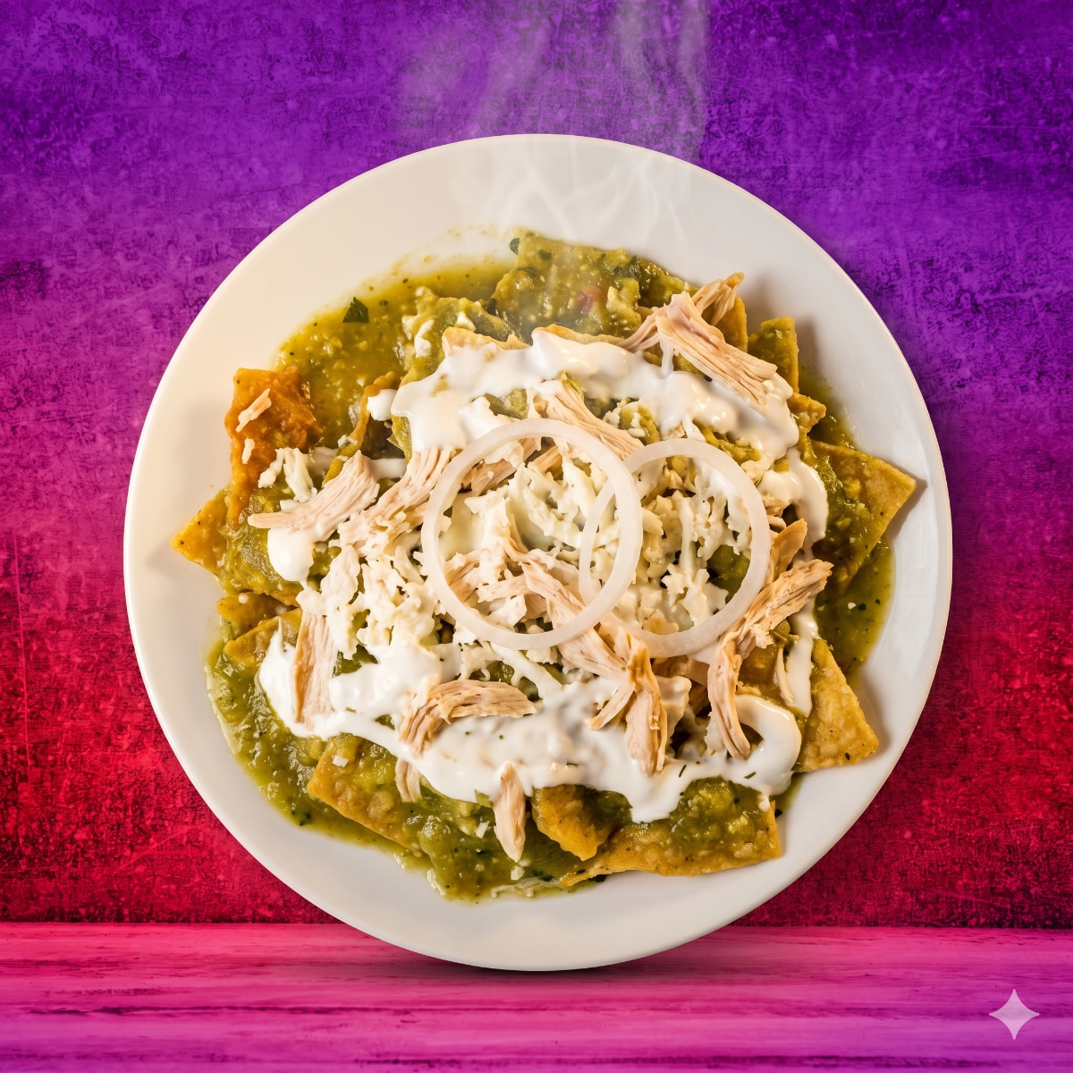 Totopos crujientes bañados en salsa verde o roja, servidos con crema, queso ranchero y cebolla fresca.