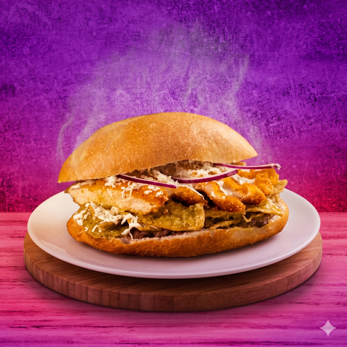 Crujiente milanesa dentro de un bolillo con frijoles y chilaquiles verdes o rojos.
