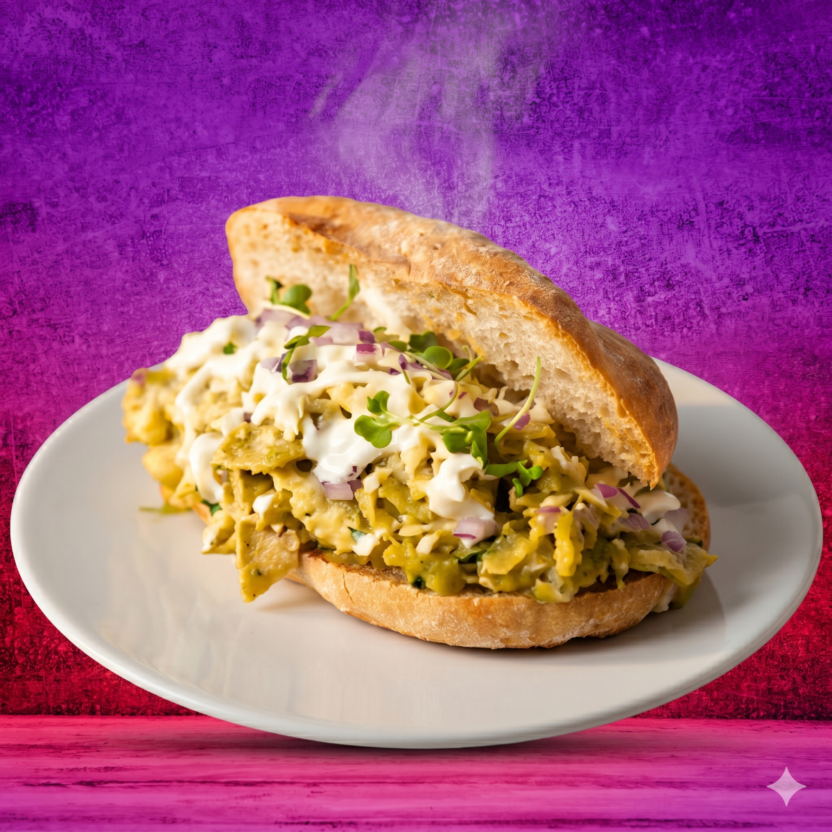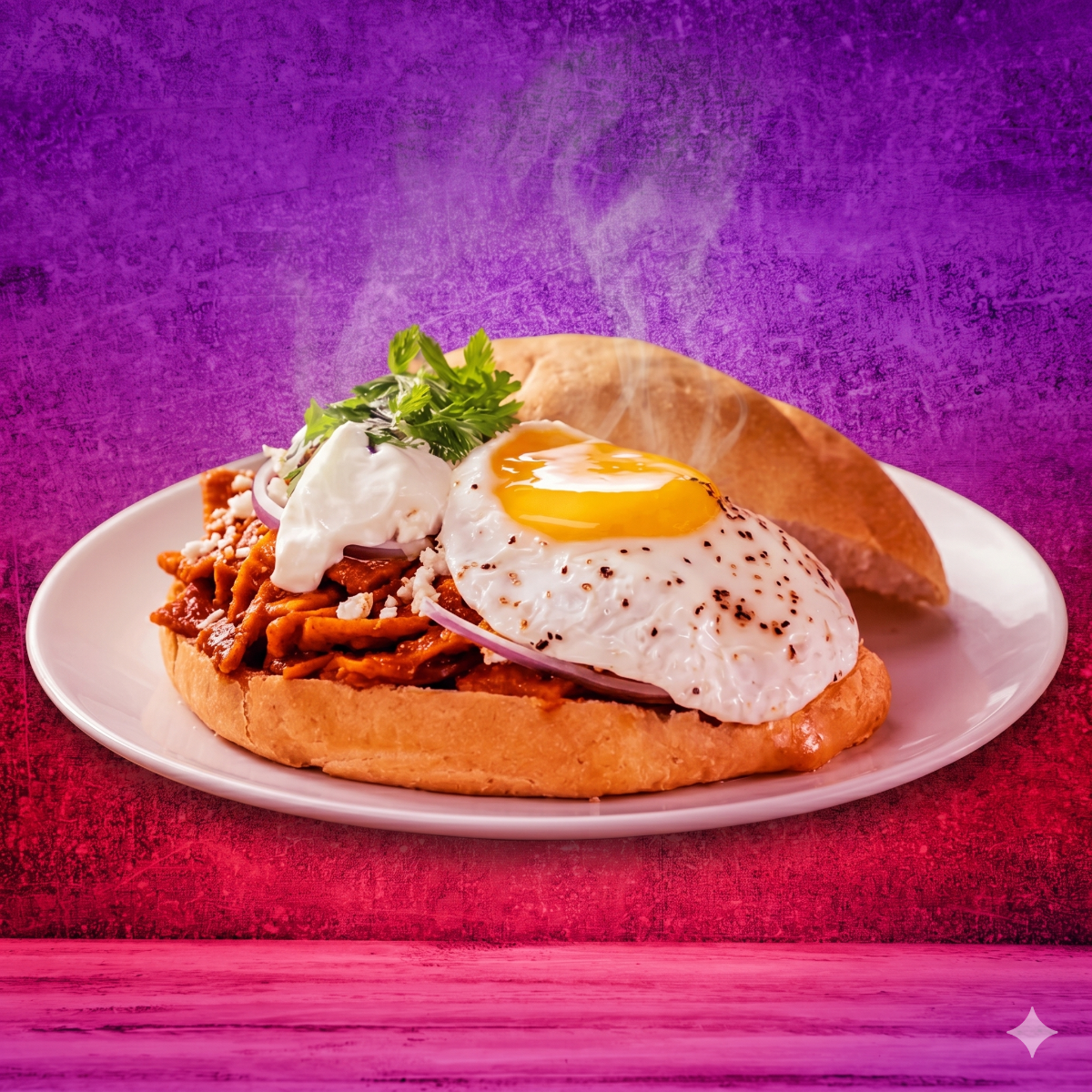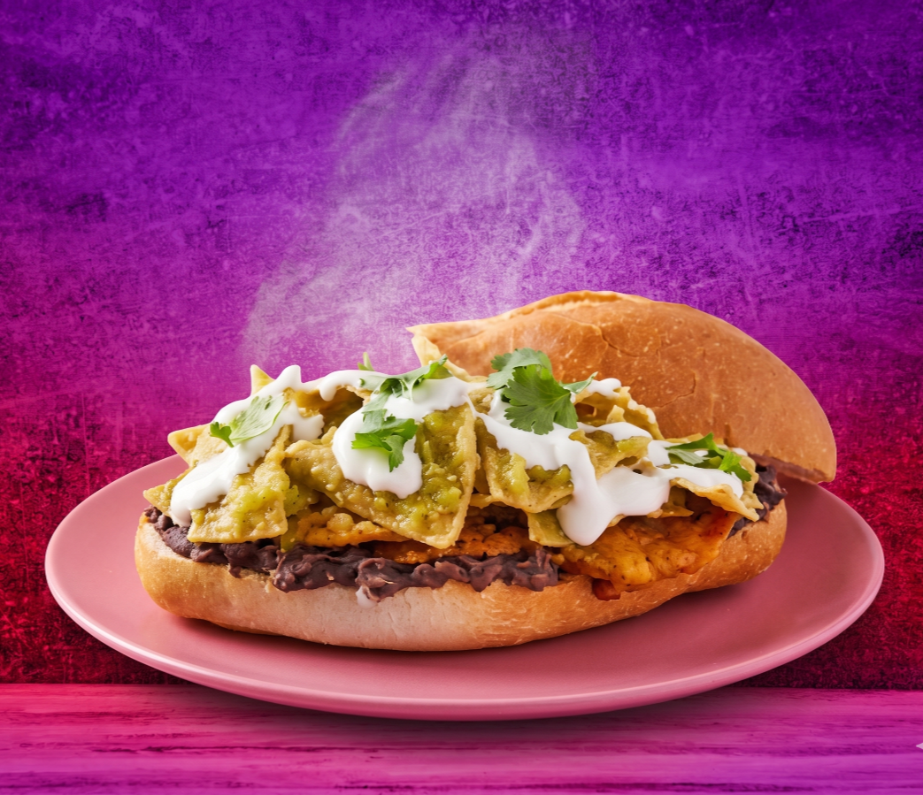 Torta gourmet rellena de suaves tiras de arrachera, chilaquiles, crema, queso y frijoles.