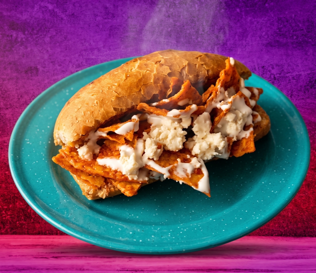 La favorita: bolillo con frijoles, chilaquiles y generosa porción de pollo deshebrado con crema y queso.