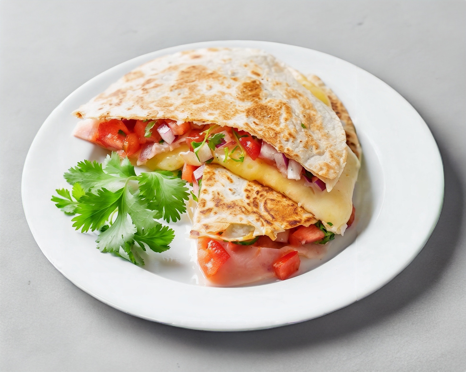 doble Tortilla de harina partida ala mitad con queso Oaxaca jamon, aguacate, jitomate, cebolla, salsa chipotle .