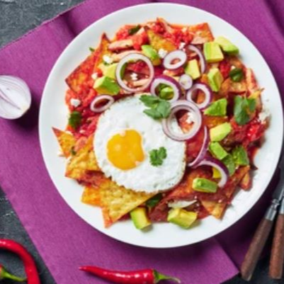 El desayuno de campeones. Una charola bien servida de chilaquiles crujientes bañados en la salsita de tu elección (roja o verde), acompañados de cebollita, cilantro fresco, crema, mezcla de quesos, aguacate y frijolitos refritos. ¡Perfectos para empezar el día con toda la actitud!