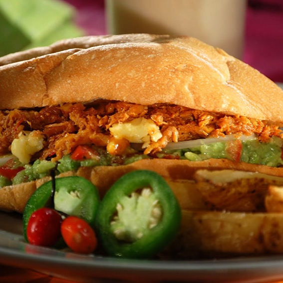 Carne selecta de arrachera (150gr), salchicha, jamón, tocino, pierna española, queso amarillo, queso oaxaca, jitomate, cebolla, chiles, aguacate en un pan artesanal con ajonjolí negro. cátsup, mostaza y mayonesa.