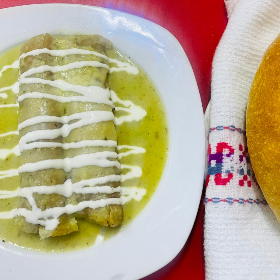 Enchiladas verdes con pollo, queso y crema, De regalo un caldito de gallina (Escoge tus ingredientes :arroz, garbanzo, Cebolla, Cilantro, Limón) y bolillo de cortesía.