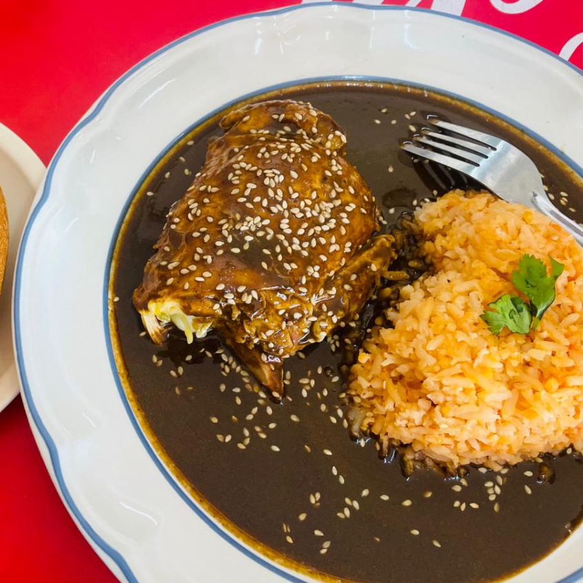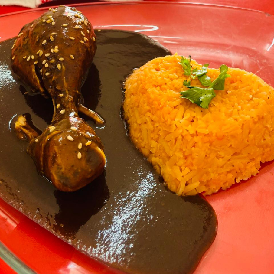 Pieza de POLLO (Pierna) Acompañada de Arroz y Mole Rojo De regalo un caldito de gallina (Escoge tus ingredientes :arroz, garbanzo, Cebolla, Cilantro, Limón) y bolillo de cortesía.